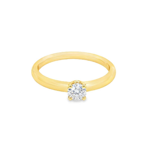 This is a solitaire ring with a round brilliant cut diamond which is set in 14 Karat yellow gold. This is a simple but elegant diamond engagement ring. The diamond has 0.25 carat weight, the clarity is VVS and the colour of the diamond is F. This is an excellent choice for those who prefer top quality diamonds.