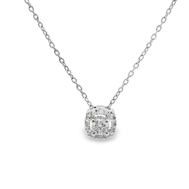 This elegant Cushion Diamond Halo Necklace is beautifully crafted in 14-karat gold. It features sparkling diamonds totaling 0.14 carats. The diamonds are of exceptional quality, and we rate them at Clarity VS and Colour F. Therefore, this piece is designed for maximum brilliance and classic style.