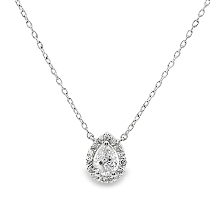 This versatile accessory is perfect for adding simple elegance to any outfit. The brilliance of the design ensures that this Pear-cut Diamond Halo Pendant/Necklace captures light from every angle, making it an ideal choice for both daylight and evening wear. Our expert jewelers meticulously inspect every 14K gold setting and diamond to guarantee superior craftsmanship and lasting beauty.