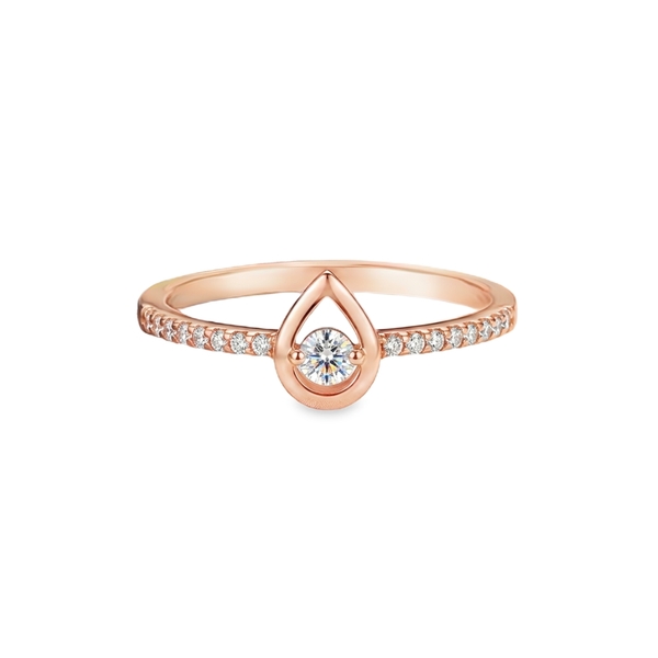 This delicate and modern ring is crafted from lustrous 14K rose gold. It features a unique, pear-shaped design at its center, which holds a single, brilliant-cut diamond. The total carat weight of the diamonds is 0.07 pts. The band itself is a beautiful pavé setting, with a row of small, sparkling diamonds that extend halfway around the ring. This design adds an extra touch of brilliance and creates a shimmering effect that catches the light beautifully. This ring’s minimalist yet elegant style makes it a versatile piece for everyday wear or a subtle statement for a special occasion. It would also serve as a perfect promise ring, anniversary gift, or a beautiful addition to a ring stack.