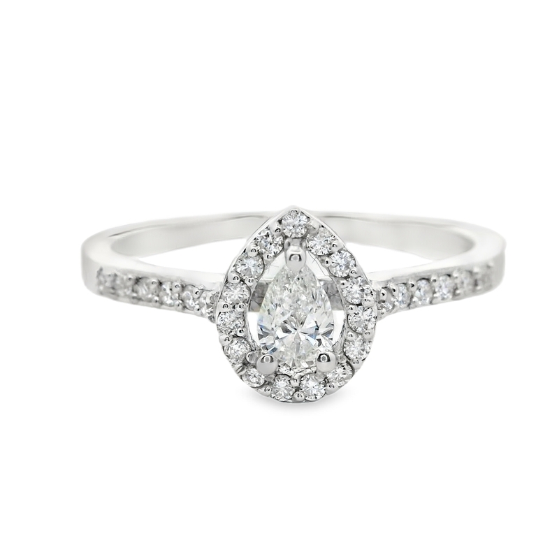 Experience captivating brilliance with this breathtaking engagement ring. It showcases a magnificent Pear-Shaped Diamond, framed by a luminous halo of accent stones that amplify its size and fire. Expertly crafted in gleaming 14-Karat White Gold, the ring’s sparkle flows seamlessly onto the band, where delicate pave-set diamonds create an uninterrupted stream of light. This design maximizes visual impact, offering a look of dramatic elegance and lasting luxury.