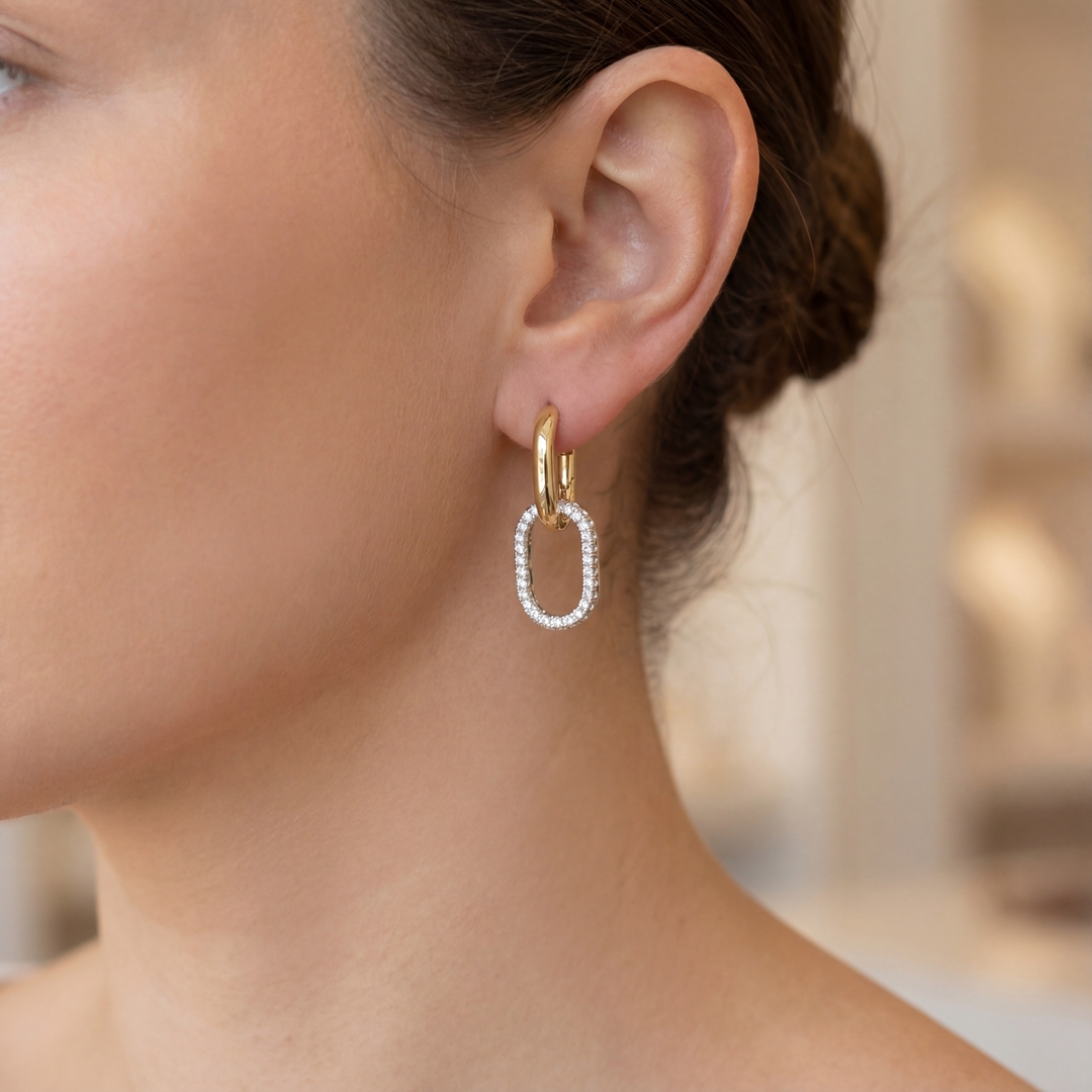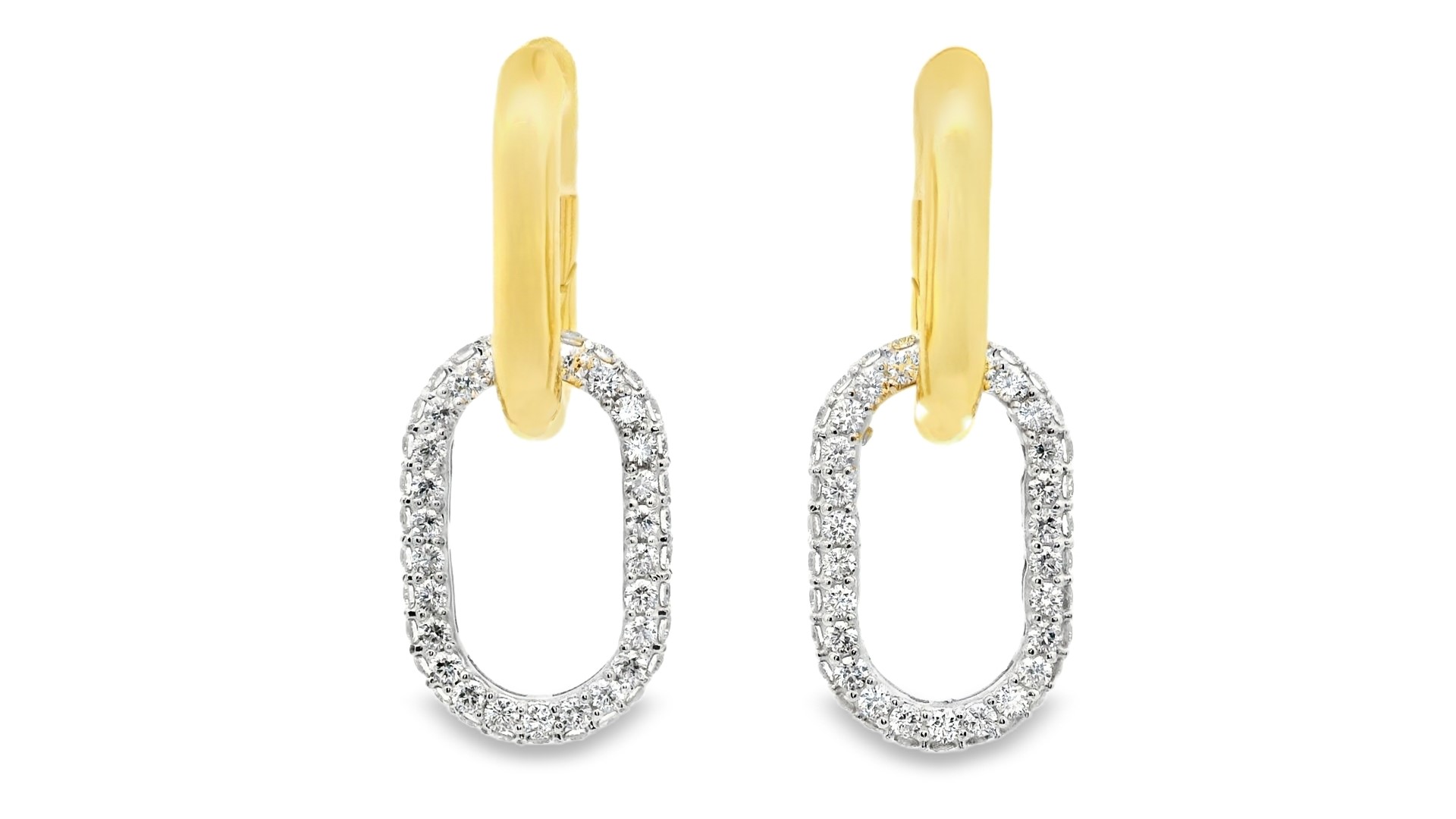 These 18K Yellow Gold Diamond Earrings feature a total weight of 2 carats of high-quality natural diamonds. Every stone boasts a prestigious D-color grade, representing the pinnacle of colorlessness. Furthermore, the VVS clarity ensures an exceptionally clean and brilliant appearance under magnification. We set these diamonds in a professional pave style within elegant oval links. This intricate setting allows each diamond to capture and reflect light from every angle. Therefore, the earrings provide a continuous and dazzling sparkle with every movement of your head. The sophisticated two-tone design separates the polished 18K gold huggie tops from the diamond-encrusted drops. This architectural layering adds a layer of modern sophistication to the classic link silhouette. Moreover, the secure click-to-close clasps provide exceptional comfort and safety for all-day wear.