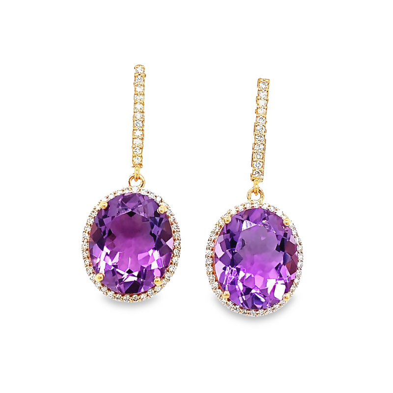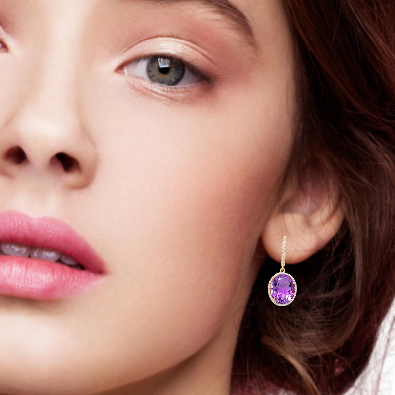 This pair of dazzling 18k rose gold earrings features two oval-cut amethyst gemstones with a total of 8.54 carat weight that are surrounded by a total of 0.45 carats round brilliant diamonds. The stones are prong-set in a four-prong basket setting. It is a beautiful pair, perfect for any day, any occasion, and any outfit. The amethyst gemstones have a rich purple hue that shine in the light.