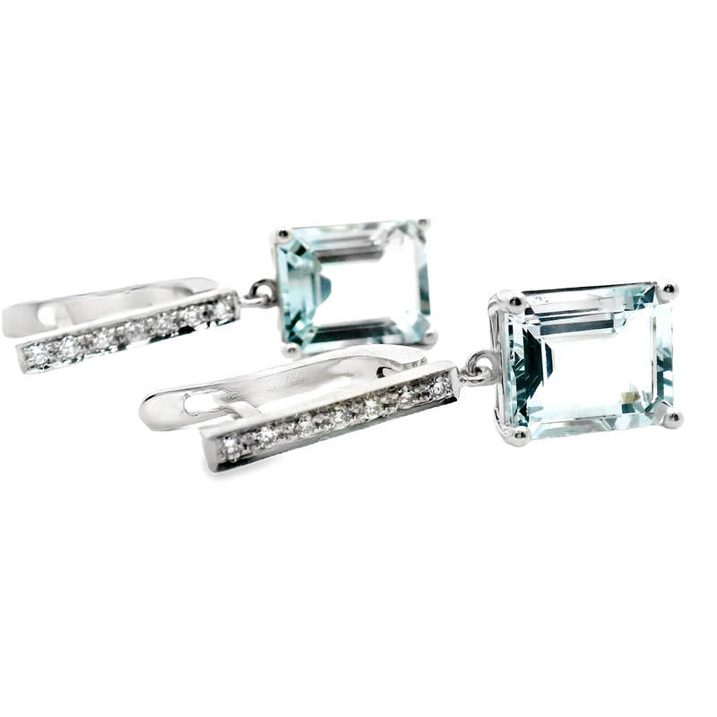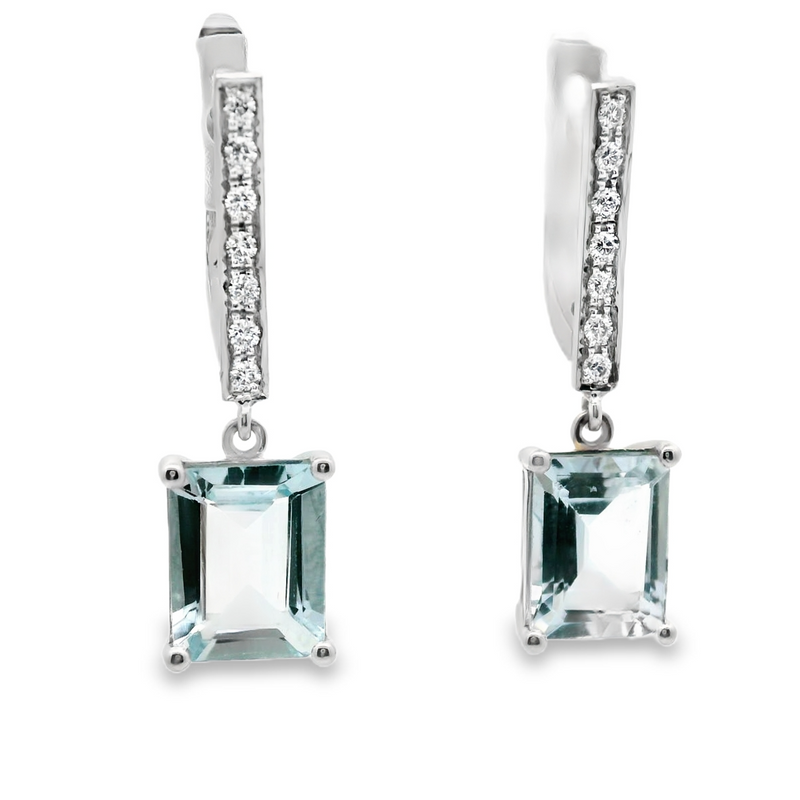 These 18K white gold pair of drop earrings feature a beautiful combination of Aquamarines and Diamonds. Rectangular-cut Aquamarines add a modern and geometric touch, while diamonds set along the top create a sparkling line of light. A leverback closure ensures a secure and comfortable fit. Versatile and elegant, these earrings are perfect for formal events, weddings, or special nights out. The classic design and high-quality gemstones make them a timeless piece of jewelry.