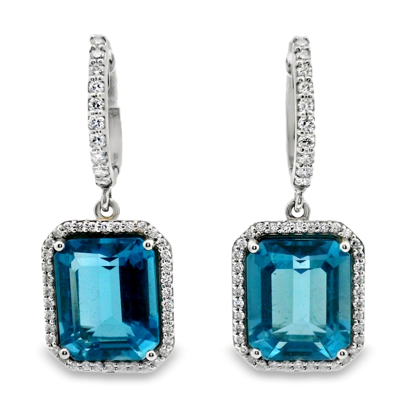 This is a striking pair of earrings featuring rectangular, emerald-cut London Blue Topaz gemstone in the center, surrounded by a halo of small, round diamonds. The deep, captivating blue of the gemstones are accentuated by a halo of smaller, sparkling diamonds, set in 18K white gold. The halo setting consists of numerous small, colorless diamonds that add sparkle and enhance the center stone’s brilliance. The earrings have a lever-back closure with a hoop design, also encrusted with small diamonds.
