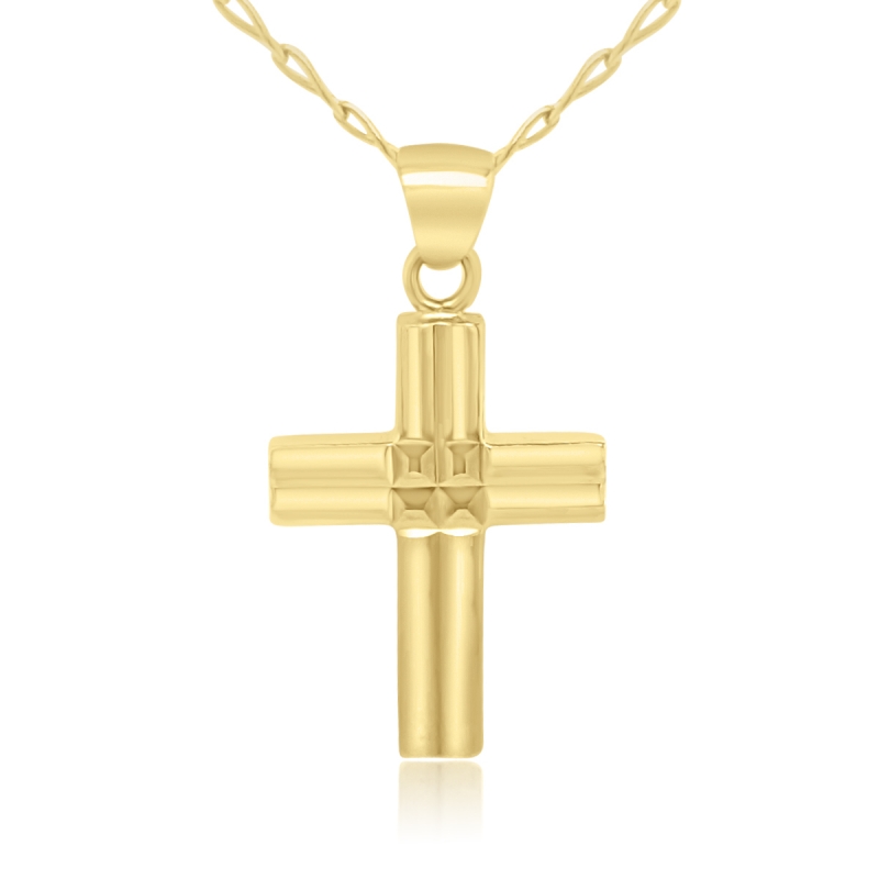 This is a traditional Christian cross pendant, a timeless piece of jewelry that can be worn for any occasion. Its elegant, tubular shape is suitable for both men and women. Crafted from genuine 18K Gold, the pendant features a distinctive texture centered on all four arms of the cross. This detailed surface catches the light beautifully, creating a subtle sparkle and enhancing the pendant’s dimension.