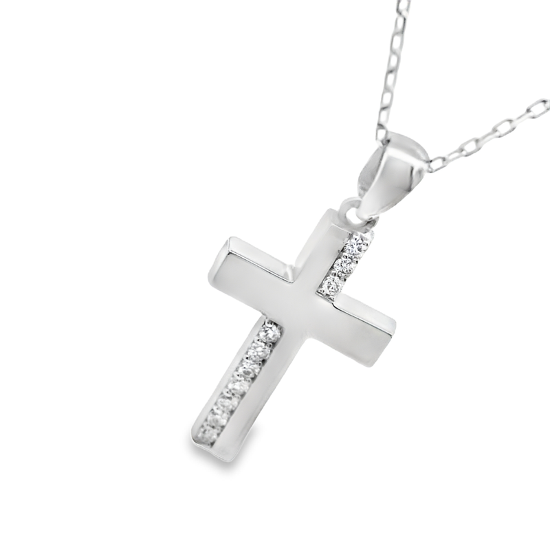This finely crafted piece serves as a stunning symbol of faith and devotion, making it an ideal choice for christening celebrations. The delicate cross pendant boasts a lustrous shine adorned with shimmering diamonds and showcasing the exceptional quality of the 18K white gold material. The cross is suspended from a lightweight yet durable 18K white gold chain.
