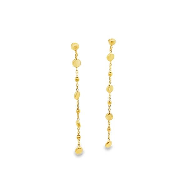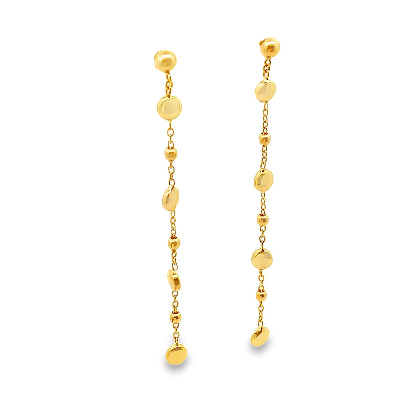 Introduce delicate movement and high polish to your look with these elegant 18K Yellow Gold Long Drop Earrings. Each earring features a sophisticated vertical dangle design, combining small polished oval or circular discs with petite gold bead segments. The alternating pattern and delicate chain links create a subtle, graceful flow that beautifully catches the light. Crafted entirely from luminous 18-karat gold, these earrings offer exceptional shine and quality. Their substantial length and refined design make them perfect for adding sophisticated drama to evening wear or elevating a simple daytime outfit.