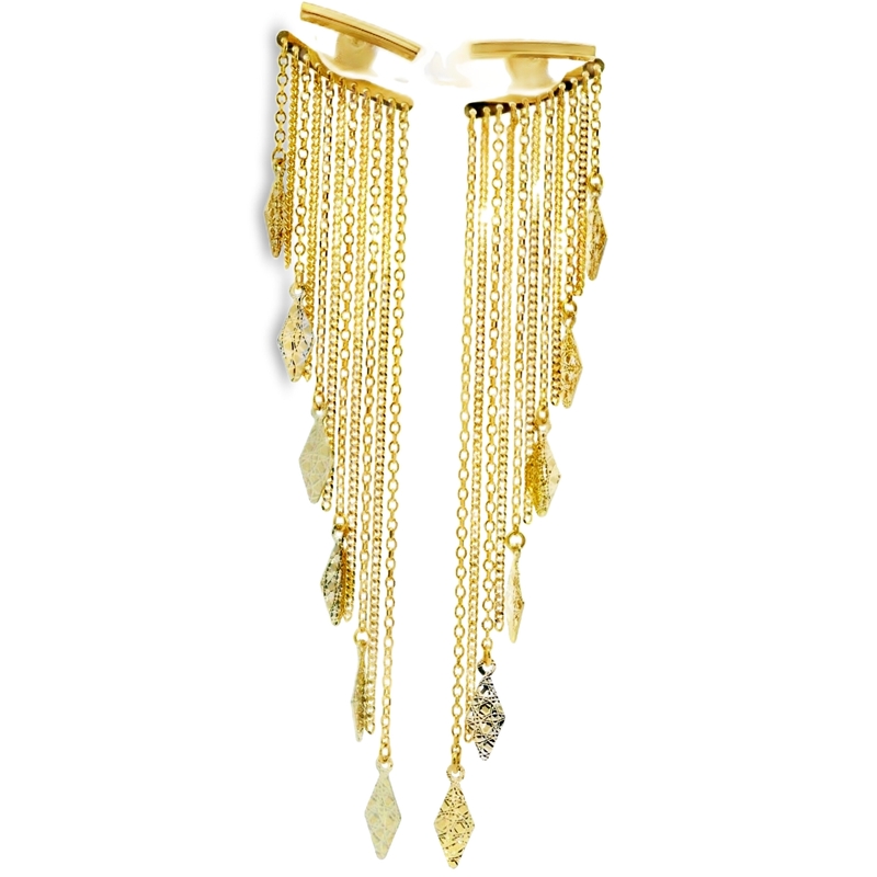 The earrings are made of rich and lustrous 18K yellow gold, giving them a luxurious and warm tone. The earrings have a linear, elongated silhouette, designed to hang well below the earlobe. They consist of multiple fine gold chains of varying lengths, creating a layered and cascading effect. The chains appear to be a delicate link style, allowing for fluid movement. Interspersed along the lengths of the chains are small, lightweight pendants. These pendants have a consistent diamond shape but feature different surface textures and finishes.  The multiple strands of chains and the dangling pendants will create significant movement when worn, making them very eye-catching and dynamic. The earrings feature a secure and comfortable fastening mechanism suitable for their length and weight, such as post backs with clutches. These earrings exude a sophisticated and fashionable style, perfect for evening wear or special occasions. They combine the elegance of gold with a contemporary, statement-making design.