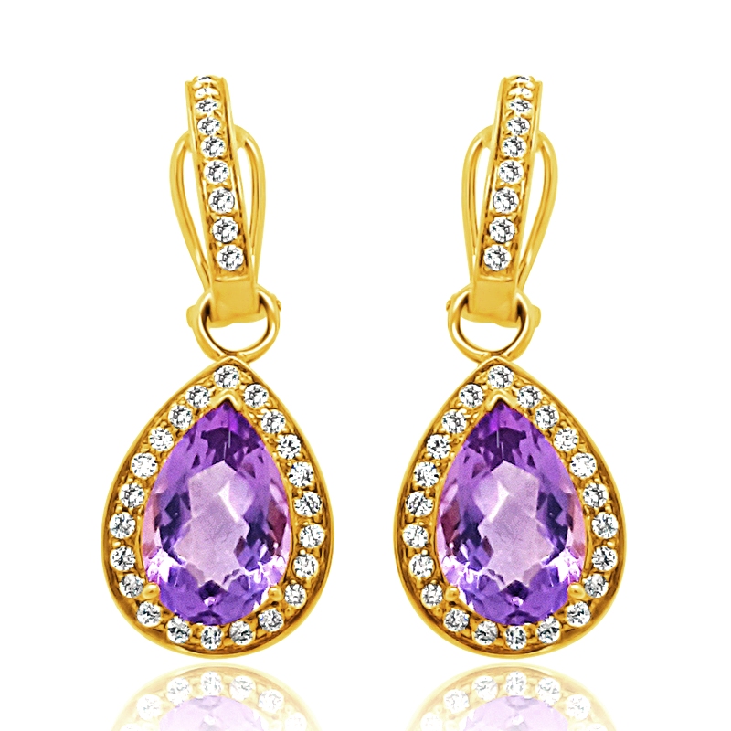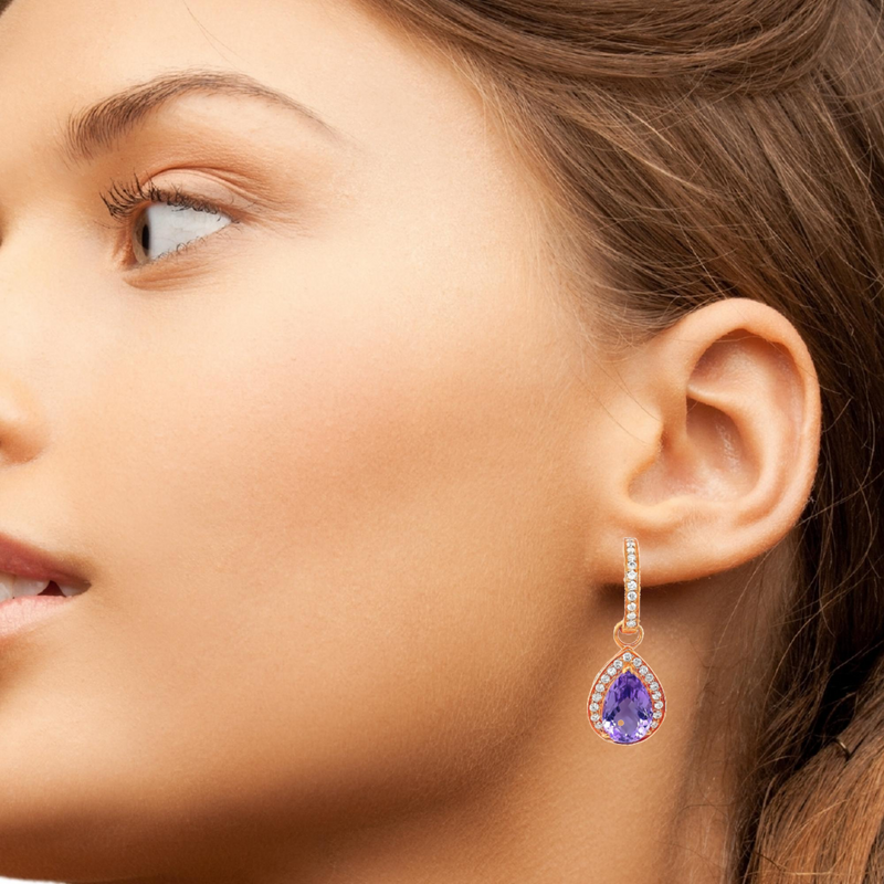 Our earrings are designed to be the perfect accompaniment to any outfit. This pair is no exception. It features a total of 1.19 carats diamonds (66 pcs), each one carefully selected by our team of expert jewelers. These drop diamond and amethyst earrings are set in 18K rose gold and feature pear cut amethysts with a total of 8.34 carats and round brilliant diamonds. The earrings are a dangling style with a snap hinge closure.