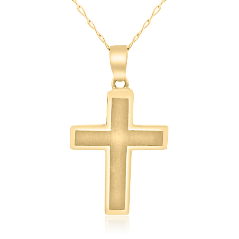 This is a traditional Christian cross pendant, a timeless piece of jewelry that can be worn for any occasion. Crafted from genuine 18K Gold, the pendant features a distinctive diamond-cut texture centered on all four arms of the cross. This detailed surface catches the light beautifully, creating a subtle sparkle and enhancing the pendant’s dimension.