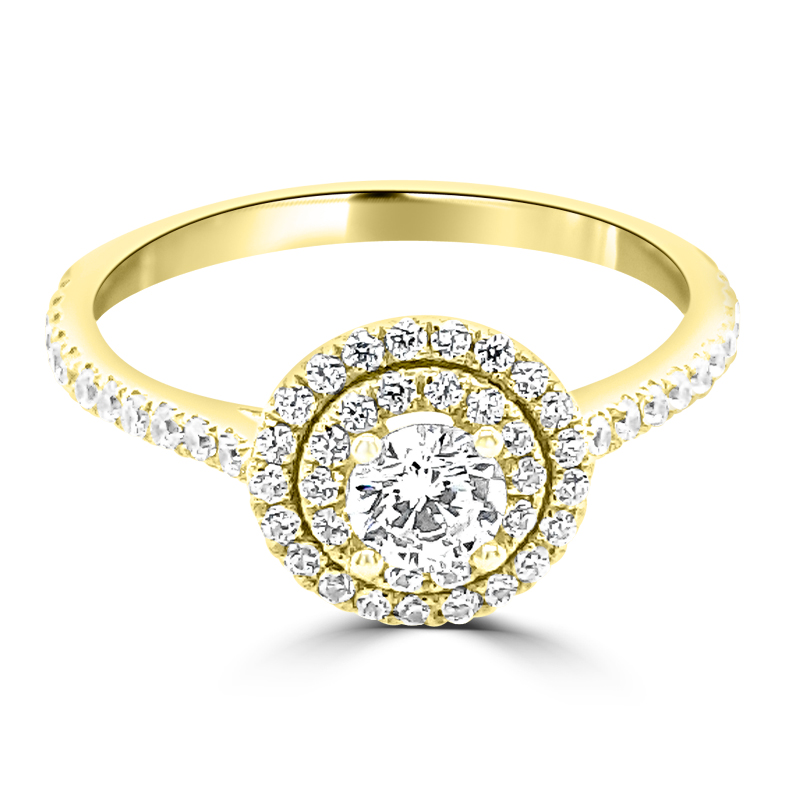 This is the most beautiful diamond engagement ring. The ring is made from 18k yellow gold and has a halo design. The ring has a round brilliant 0.15 pts diamond in the center, which is surrounded with two rows and on the sides of the band (0.20 pts ) by smaller sparkling diamonds. The elegant halo design is something that you will find unique and different.