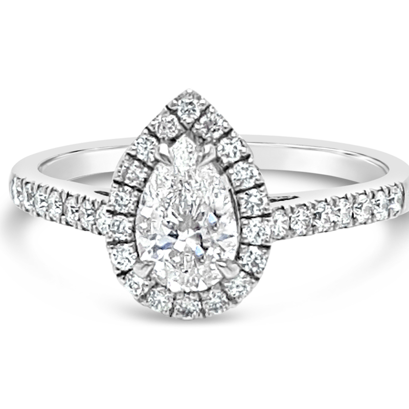 This unique engagement ring features a 0.44 carat pear brilliant cut diamond on a halo setting with diamonds on the side of the band. The solitaire diamond is surrounded by a cluster of diamonds on the halo setting, adding sparkle and shine to this classic ring. The elongated shape also flatters the wearer as it makes the finger look slimmer and longer.
