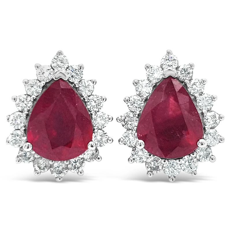 These gorgeous earrings are composed of round brilliant 0.67 carats diamonds and pear cut glass field rubies with a total of 8.93 carats that are set in an 18K white gold prong setting. The pair is made by our expert jewelers. Each diamond is handpicked and set to perfection. It is classic, elegant, and definitely an impressive piece of jewelry.