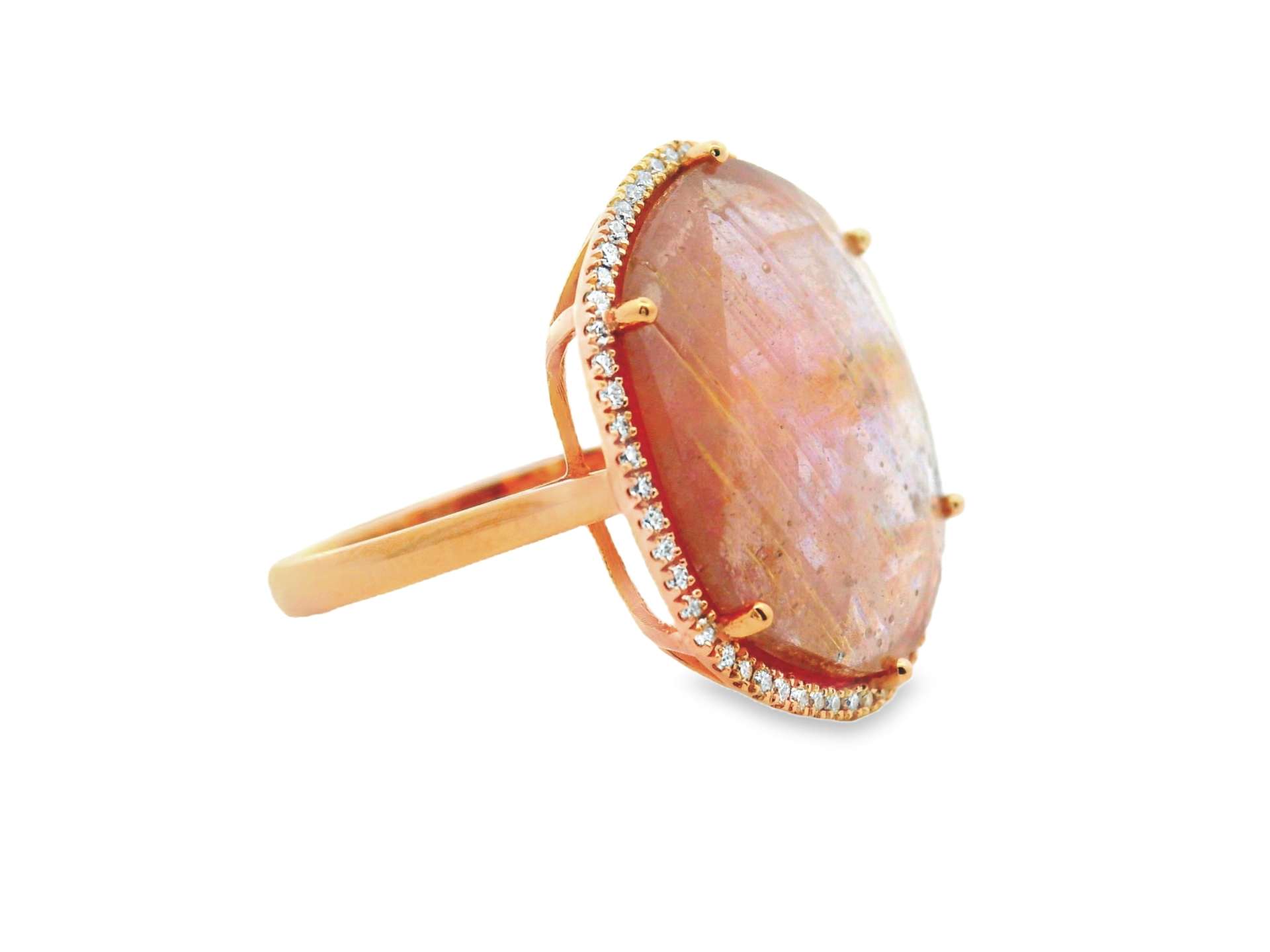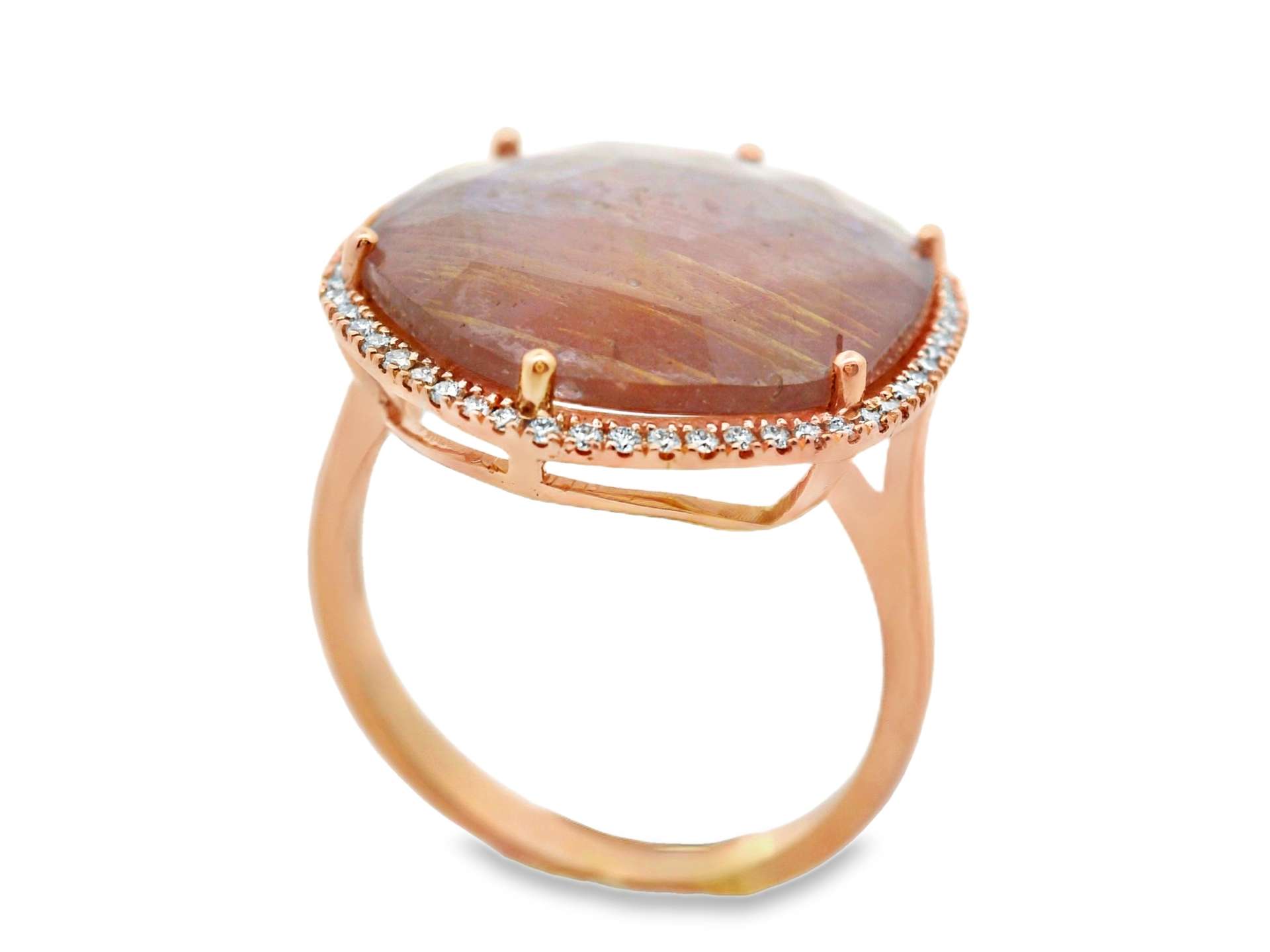 The ring is crafted in 18K rose gold and features a large, faceted rosette Sapphire as the centerpiece. The Sapphire has a beautiful pink color with visible inclusions that add to its unique character. The rosette pattern is formed by the inclusion of microscopic needle-like crystals of rutile within the sapphire. Surrounding the Sapphire there is a delicate halo of diamonds adding to its sparkle and elegance.