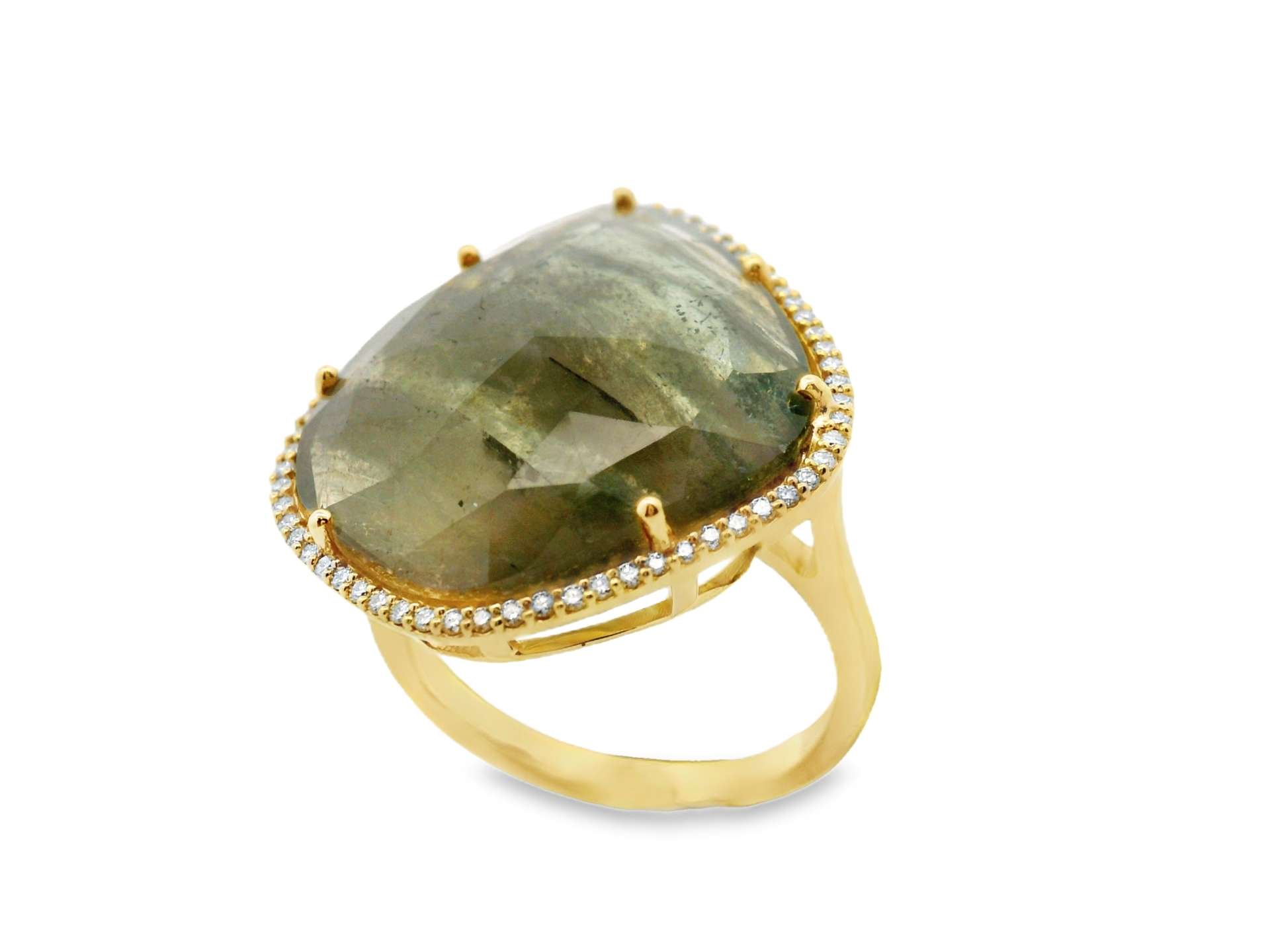 The ring is crafted in 18K yellow gold and features a large, faceted rosette Sapphire as the centerpiece. The Sapphire has a beautiful greenish-brown color with visible inclusions that add to its unique character. The rosette pattern is formed by the inclusion of microscopic needle-like crystals of rutile within the sapphire. Surrounding the Sapphire there is a delicate halo of diamonds adding to its sparkle and elegance.