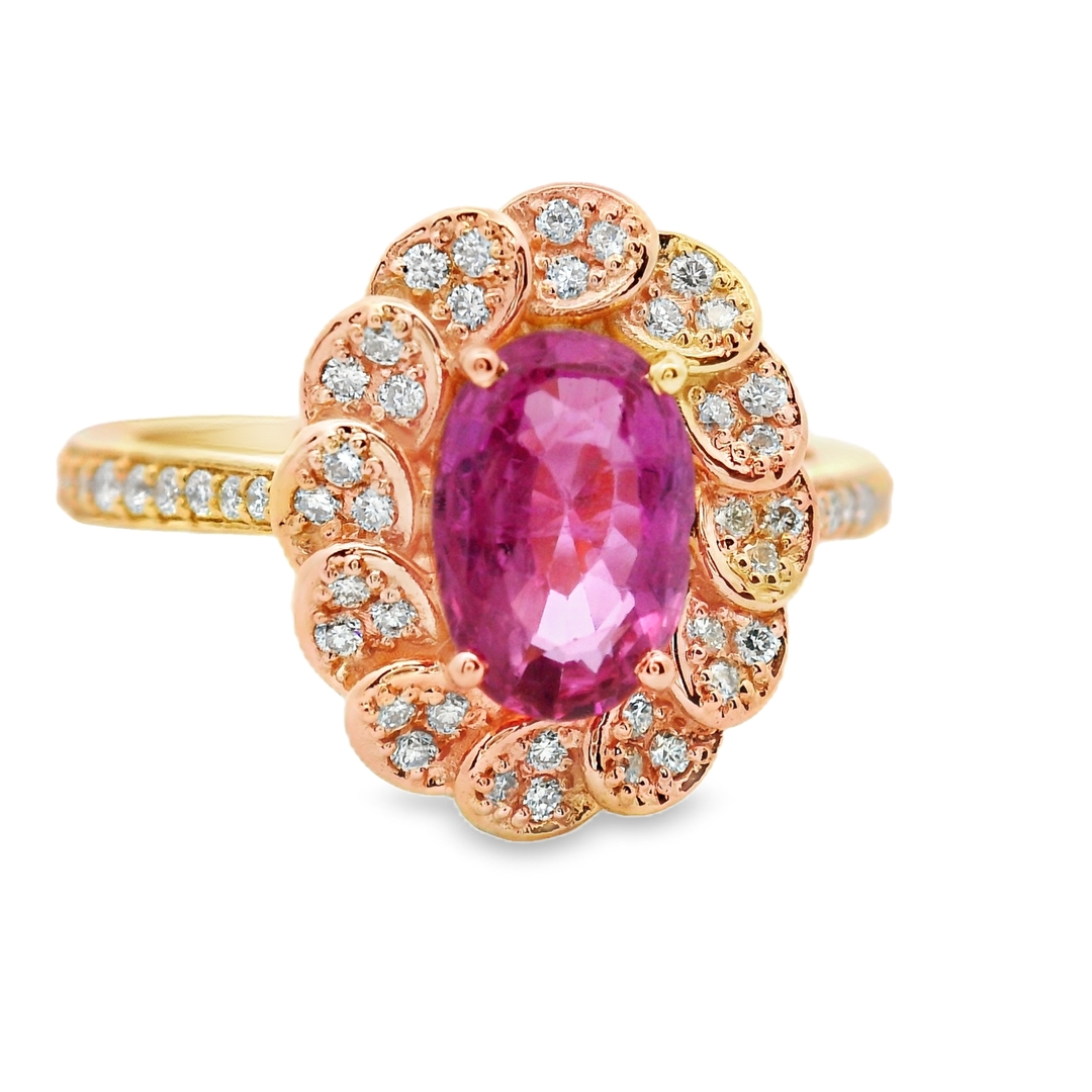 This enchanting ring features radiant 18 karat rose gold, showcasing a truly unique design. At its heart, a vibrant 1.17 carat natural pink sapphire glows with a soft, intense hue. This oval-cut sapphire is beautifully surrounded by a special halo. Here, individual petals cleverly alternate between polished rose gold and each petal is meticulously set with dazzling natural diamonds. These accent diamonds, totaling 0.20 carats, boost the sapphire’s brilliance and add to the ring’s overall sparkle. Delicate diamonds also adorn the ring’s shoulders, blending smoothly into the band. This piece beautifully combines the warmth of rose gold with the sparkle of diamonds and the charm of pink sapphire. It creates an elegant, eye-catching accessory, perfect for adding unique sophistication to any occasion.