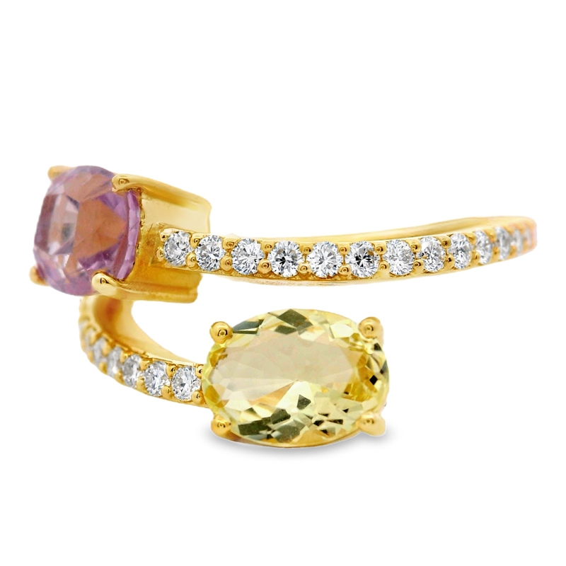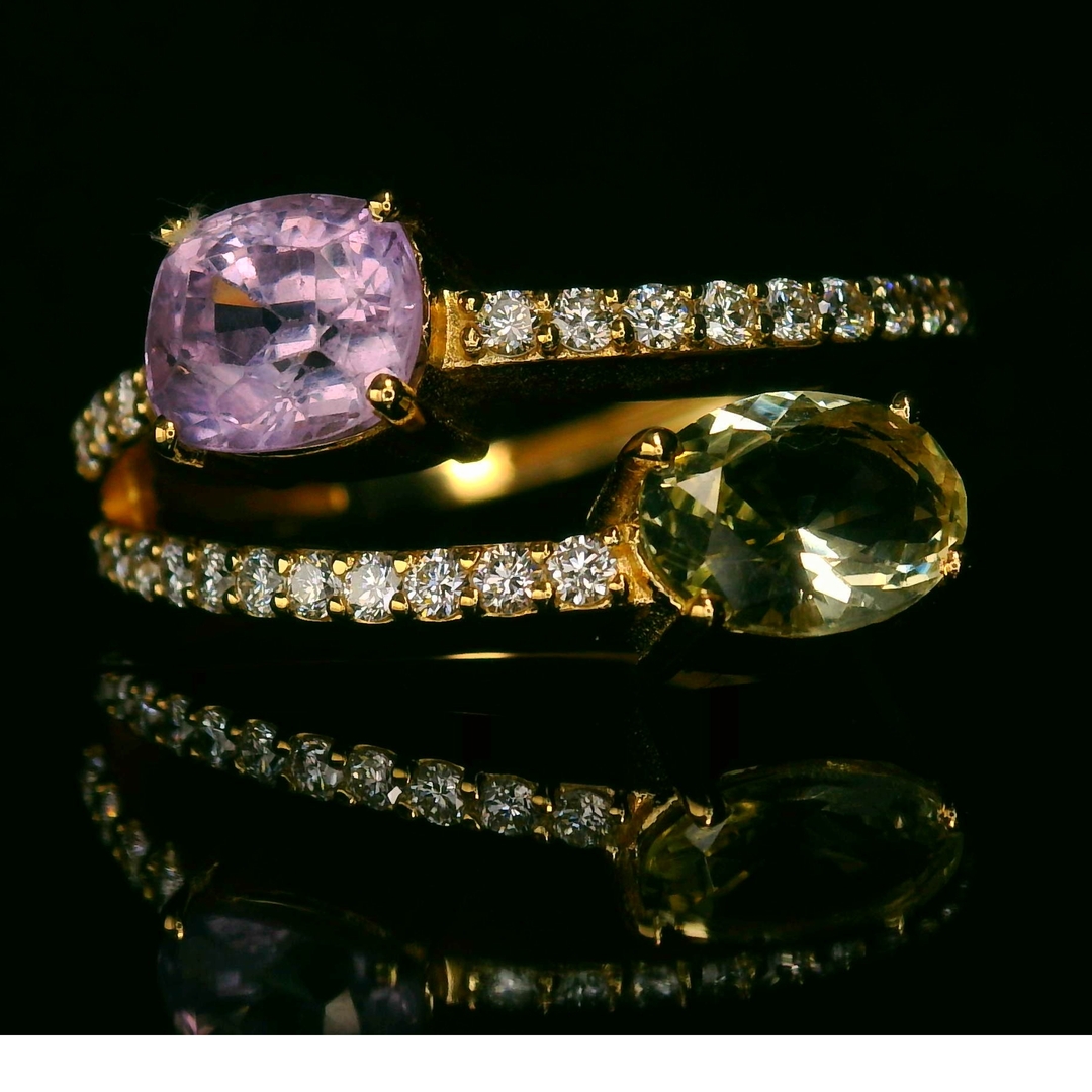 This exquisite ring features a captivating bypass design crafted from luxurious 18 karat yellow gold. It showcases a stunning combination of colored gemstones and brilliant diamonds, making it a truly unique and eye-catching piece. At its heart are two vibrant sapphires. One is a beautiful purple sapphire weighing 0.53 carats, and the other is a radiant yellow sapphire weighing 1.51 carats. These two oval-cut gems are elegantly set to create a harmonious contrast in color and size.
