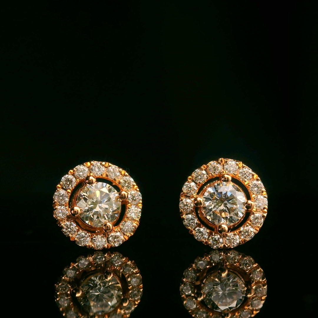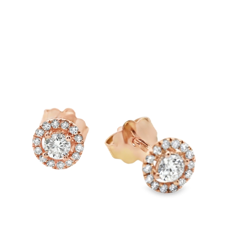 These stunning 18K rose gold stud earrings feature brilliant natural diamonds as their focal point. Each earring showcases a captivating central diamond of approximately 0.20 carats, elegantly framed by a sparkling halo of smaller natural diamonds totaling 0.10 carats per pair. The radiant halo design amplifies the brilliance of the center stones, creating a magnificent display of light. Perfect for adding timeless sparkle to any outfit, these earrings combine classic elegance with dazzling allure.