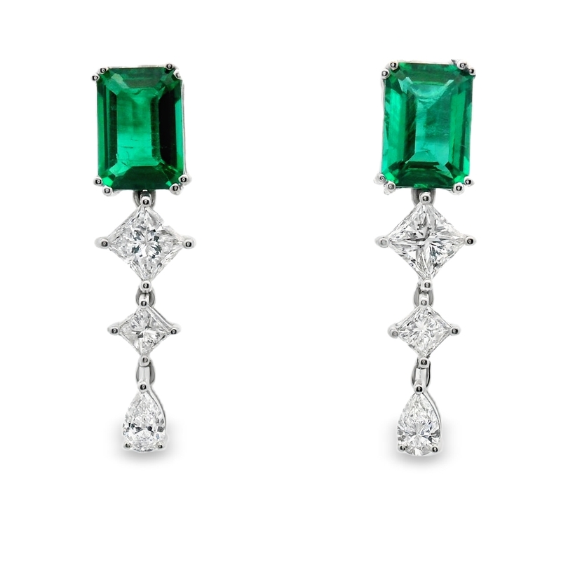 These stunning Emerald and Diamond Earrings showcase a magnificent pair of lab-grown emeralds totaling 1.76 carats. We set these vibrant emerald-cut stones in 18-karat white gold to highlight their rich green saturation. Because we use lab-grown gems, these stones offer exceptional clarity and a vivid hue that rivals the finest natural emeralds. Indeed, the cool tone of the white gold provides a perfect, modern backdrop for the lush green centers.
