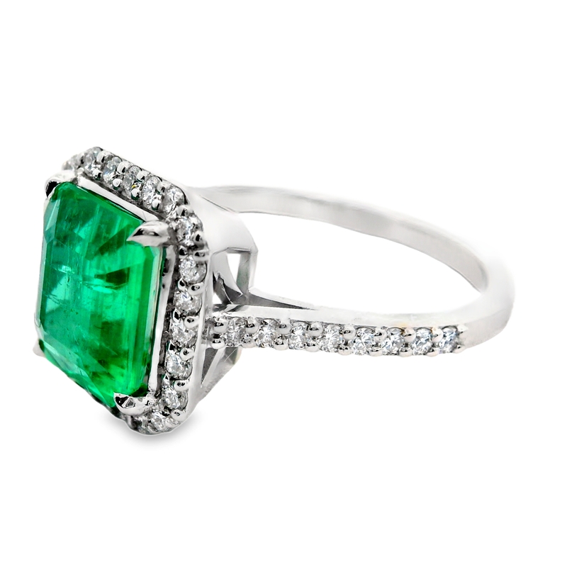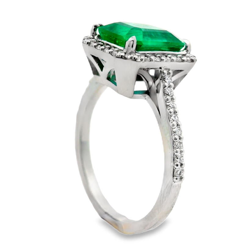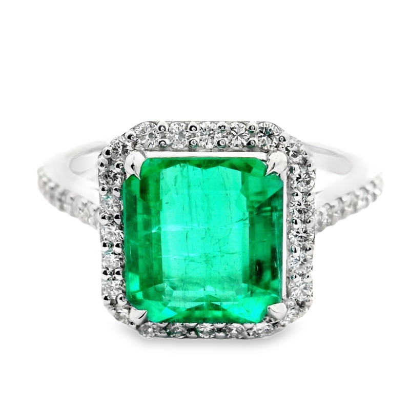 An exquisite ring showcases a vibrant Emerald as its centerpiece, surrounded by a halo of sparkling diamonds. The Emerald exhibits a rich, saturated green color, highly desirable in Emerald gemstones. A halo of small, round brilliant-cut diamonds surrounds the Emerald, enhancing its size and brilliance. Diamonds also set along the shoulders of the ring band add extra sparkle and complement the central halo design. This classic and elegant piece highlights the beauty of the central Emerald while diamonds enhance its presence and create a luxurious look. A timeless design results, suitable for special occasions or as a treasured piece for everyday wear.