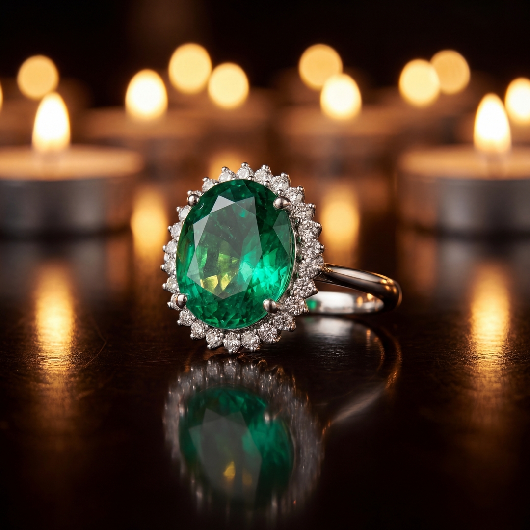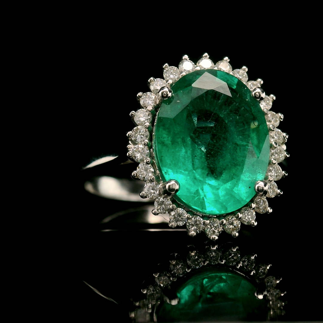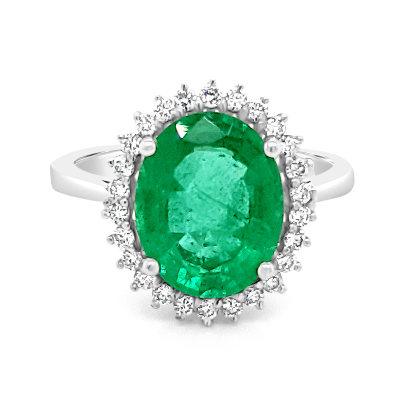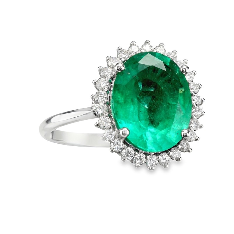Exuding sophistication, this exquisite ring features a mesmerizing oval-cut emerald, its rich, verdant green radiating natural beauty. The emerald is securely held in a classic prong setting, allowing light to penetrate and showcase its depth of color. Encircling the central gemstone is a dazzling halo of meticulously set, brilliant-cut diamonds. These sparkling accents not only amplify the emerald’s allure but also add a touch of timeless glamour to the design.