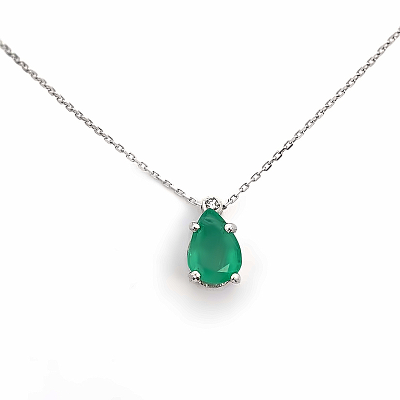The pendant is the focal point, featuring a pear-shaped (also known as teardrop) Emerald. The Emerald has a rich, saturated green color and it appears to be relatively transparent, allowing light to pass through and enhance its brilliance. The Emerald is set in a simple, four-prong setting. There is a small diamond accent at the top of the setting where the pendant loop attaches. The necklace features a thin, delicate cable chain 40cm long in 18K white gold. The necklace has an elegant and classic style. The simplicity of the design focuses attention on the beauty of the Emerald. It’s a versatile piece that could be worn for both formal and informal occasions.