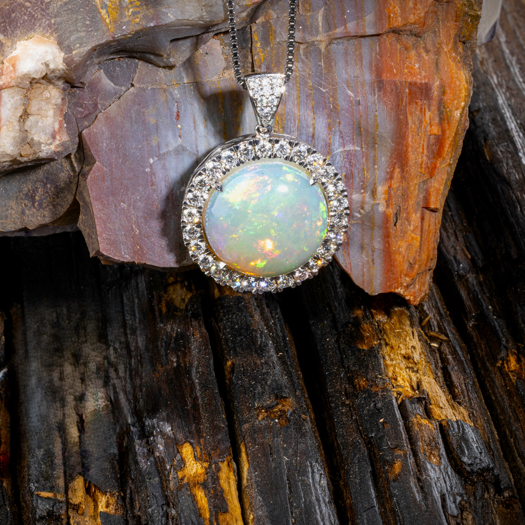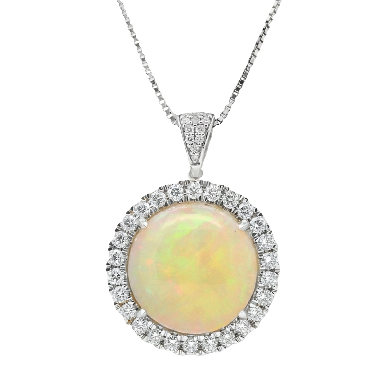 Experience the magic of the rarest gemstones with this exquisite 18K Gold Ethiopian Opal and Diamond pendant. This piece defines timeless elegance and sophistication. A stunning Ethiopian Opal sits at its heart, displaying a unique color play that contrasts beautifully with a dazzling 1.40 total carat diamond halo. Artisans expertly hand-select and arrange the diamonds, creating a seamless, glittering frame. This pendant is more than jewelry; it’s a truly royal piece that captures the enchanting world of unique gemstones.