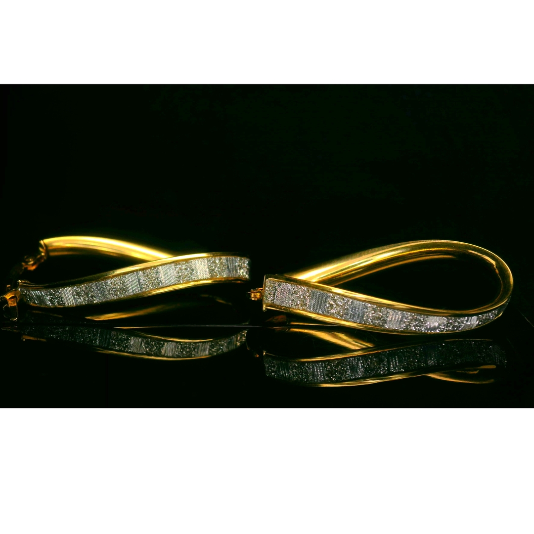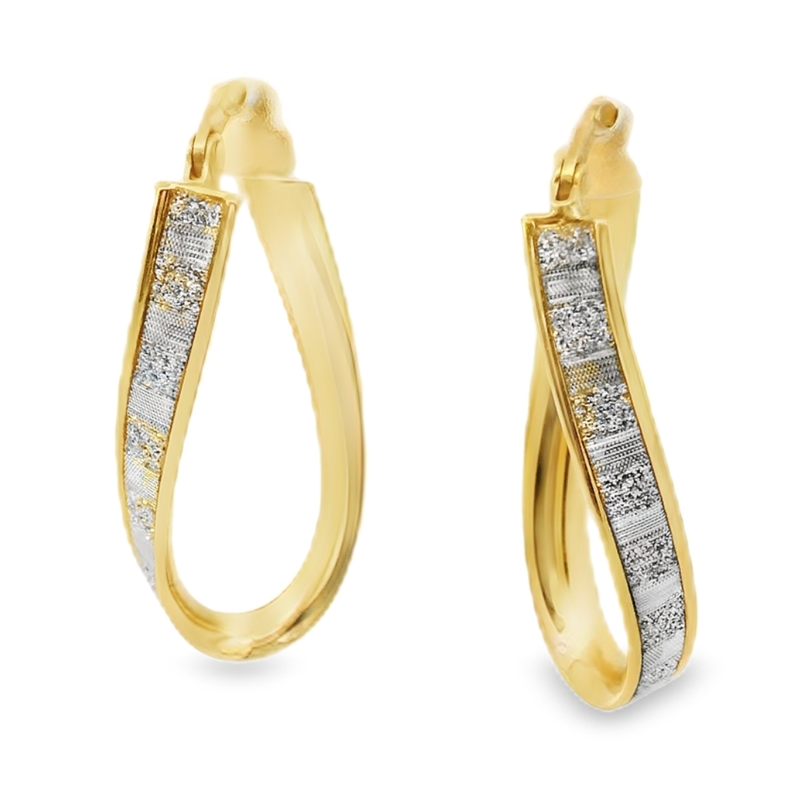 Radiant and refined, this pair of 18K gold hoop earrings presents an elegant twist on a classic. Each earring features a gracefully twisted, teardrop-shaped hoop, meticulously crafted from brilliant yellow gold. A striking contrast is achieved through a significant section of its front, which shimmers with a diamond-cut pattern in a sophisticated white gold tone. This thoughtful two-tone and textured design infuses the timeless hoop with contemporary flair and visual intrigue. Secured by a reliable hinged snap-back closure, these earrings offer both beauty and peace of mind.