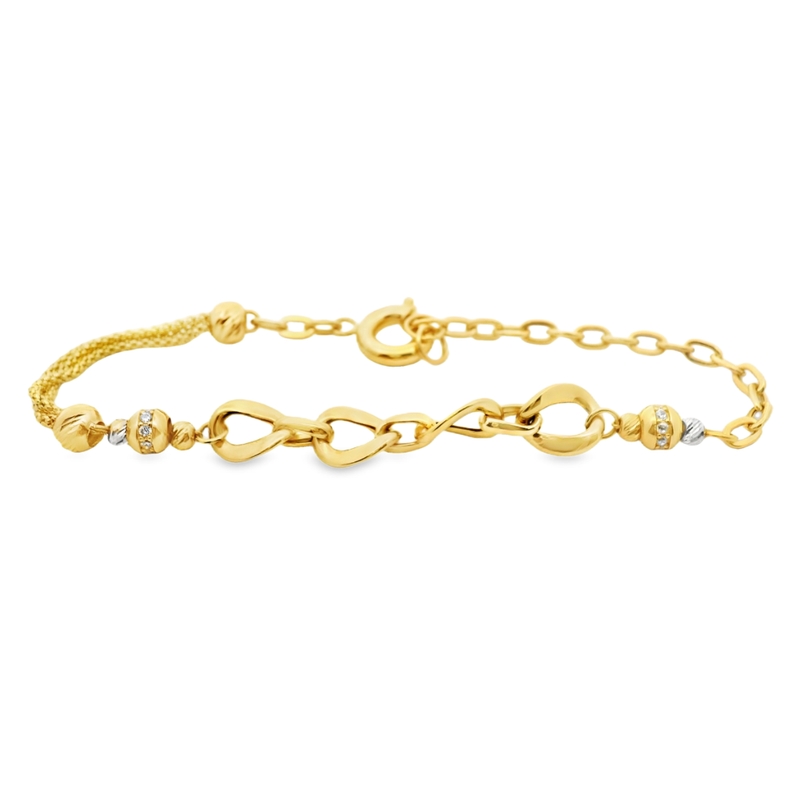 Embrace everyday luxury. This sophisticated bracelet is a testament to fine gold craftsmanship. It is expertly made from genuine 18-Karat Yellow Gold. The piece offers a dynamic yet timeless design. The centerpiece features a row of flowing, interlocking oval links. This strong, continuous pattern gives the bracelet a smooth, sleek structure. The links transition seamlessly into a delicate multi-strand chain. This creates a beautiful, layered look. The bracelet is detailed with polished, spherical gold beads. Two beads feature beautiful diamond-cut detailing and subtle white gold accents. This sophisticated touch adds shimmer and texture. The bracelet is finished with a secure lobster clasp. It is the perfect piece for solo wear or stacking.