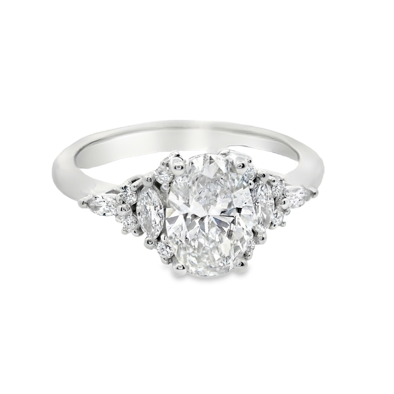 This is a stunning engagement ring featuring a prominent central oval-cut lab grown diamond. The setting is crafted from 18K white gold, providing a brilliant contrast to the diamonds. Flanking the magnificent central stone are smaller accent lab grown diamonds, including elegant marquise-cut and round brilliant stones, enhancing the overall sparkle and design. The ring’s band is classic and unadorned, allowing the brilliance of the lab grown diamonds to take center stage. Furthermore, the diamond features a microscopic laser inscription of the IGI report number on its girdle. This invisible inscription serves as a unique identifier, directly linking the lab grown diamond to its certificate and providing a crucial security feature.