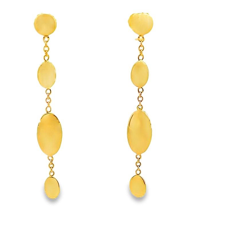Make a brilliant, sophisticated statement with these 18K Yellow Gold Long Dangle Earrings. Each earring features a streamlined column of four polished oval discs that decrease in size, linked by delicate chain segments. The sleek, high-polish finish and simple shape give these earrings a modern, liquid gold appearance. Crafted entirely from luminous 18-karat gold, they offer beautiful movement and shine, making them the perfect accessory for evening wear or adding drama to a simple outfit.