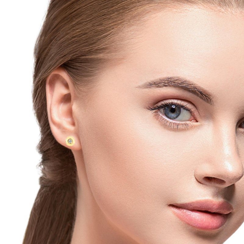 Discover the perfect everyday sparkle with these essential 18K Yellow Gold Diamond Stud Earrings. The earrings feature brilliant 0.06 points round-cut diamonds securely set within a smooth, high-polished gold bezel. This design creates a beautiful halo effect, maximizing the diamond’s brilliance while providing a modern, secure setting. Crafted entirely from luminous 18-karat gold, these studs are the definition of understated luxury. They are comfortable enough for daily wear and perfect for first piercings, second piercings, or a thoughtful gift.
