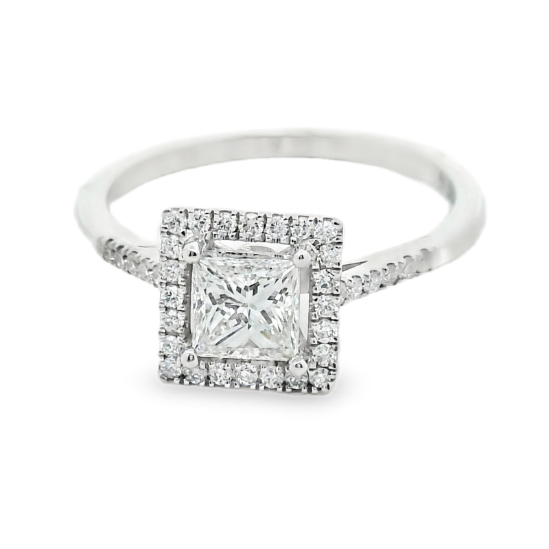 Discover the timeless elegance with this 18K white gold engagement diamond ring. The center square modified brilliant cut diamond sparkles with unparalleled brilliance, surrounded by a halo of round brilliant cut diamonds that add a touch of edgy sophistication. The sleek band is flanked by shimmering diamonds, this ring is sure to make a statement wherever you go.