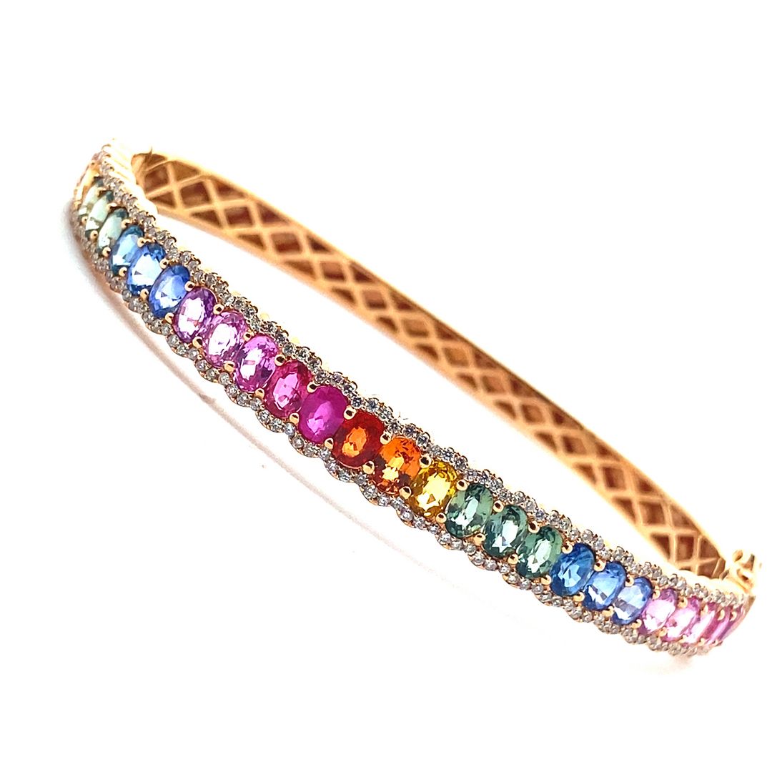Elevate your jewelry collection with this exquisite 18K Rose gold bangle adorned with a stunning array of vibrant colored Sapphires and dazzling Diamonds. The rainbow of colors in the Sapphires creates a mesmerizing visual display that is sure to capture attention. The rainbow of hues from the Sapphires creates a captivating and eye-catching effect, making this bangle a true statement piece. The smooth finish adds a touch of modernity to this timeless piece, while the high-quality craftsmanship ensures durability and longevity.