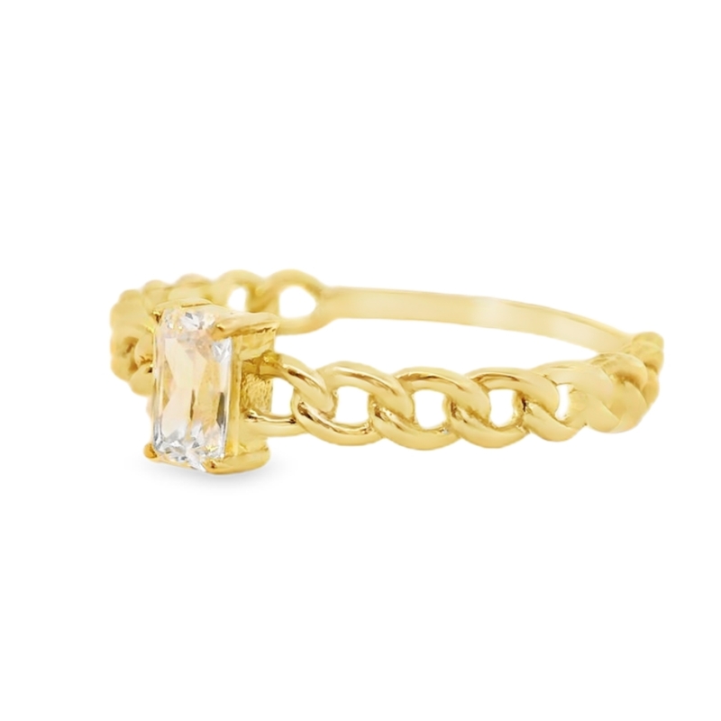 Discover modern elegance with this distinctive 18-karat yellow gold ring. It features a dazzling baguette-cut Cubic Zirconia (CZ), known for its brilliant sparkle and sleek lines. The unique chain-link band adds a bold, contemporary edge. This versatile ring combines high-karat gold with brilliant craftsmanship, perfect for adding luxury to any style.