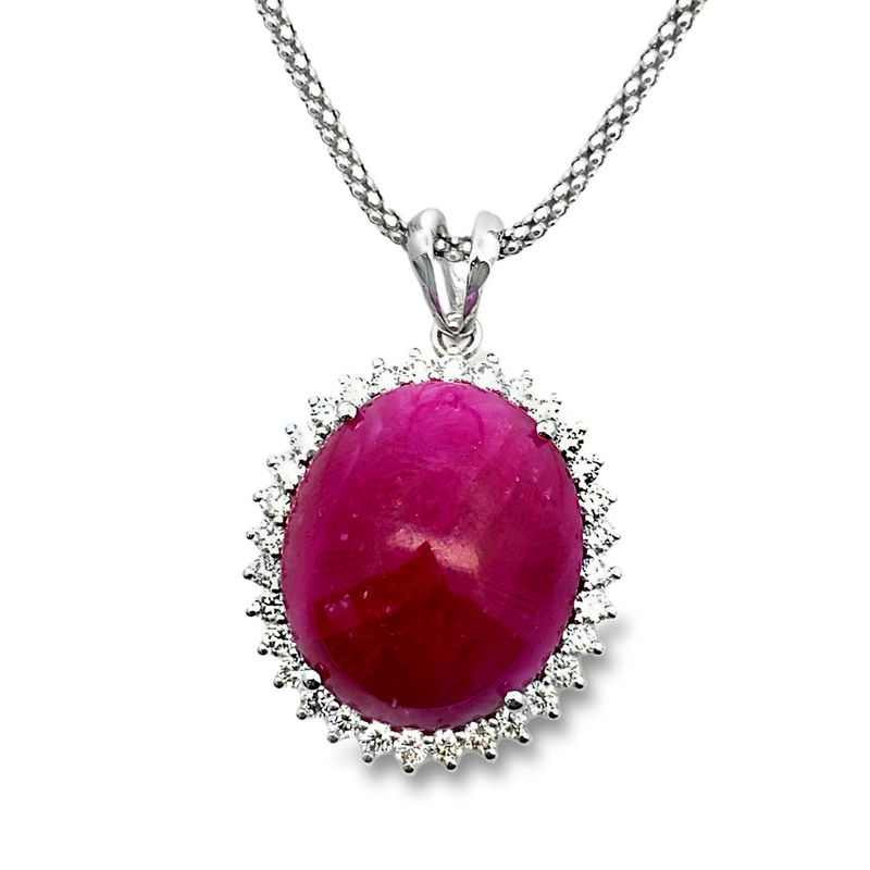 18K white gold pendant showcasing a stunning natural Ruby (heated) with a halo of sparkling diamonds. The origin of this vibrant red Ruby is from Africa, it’s a cabochon gem and weighs 21 carats. The diamonds weigh in total 0.72 carats with VS clarity and G color. This captivating piece is designed for the woman who appreciates refined elegance. Please note, the price of this pendant does not include a chain, allowing you for personalized customization.
