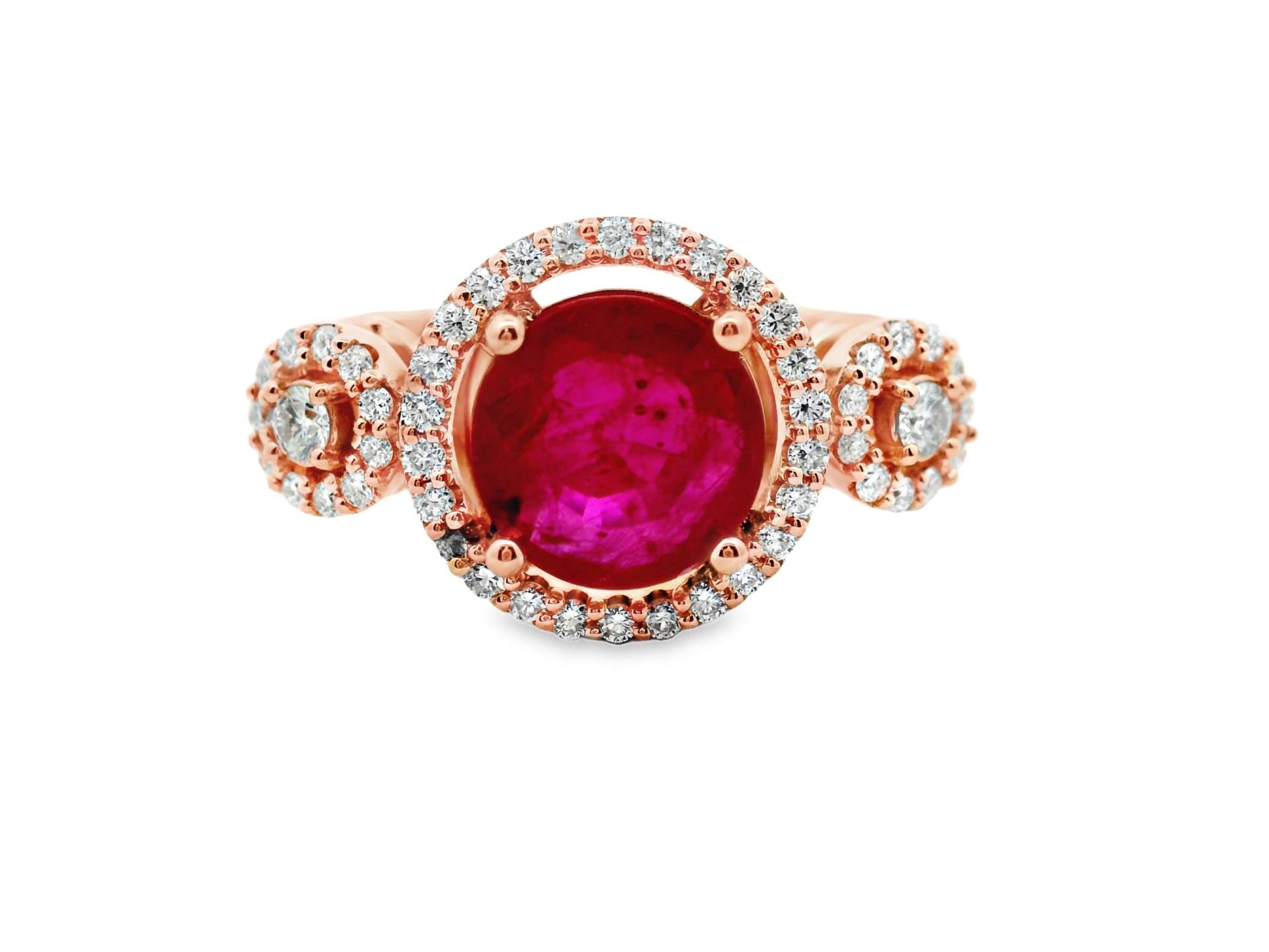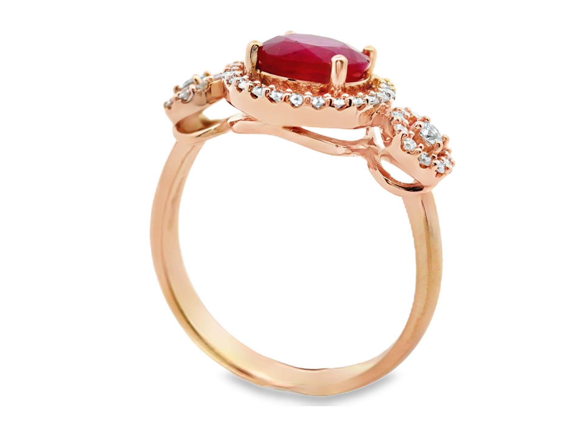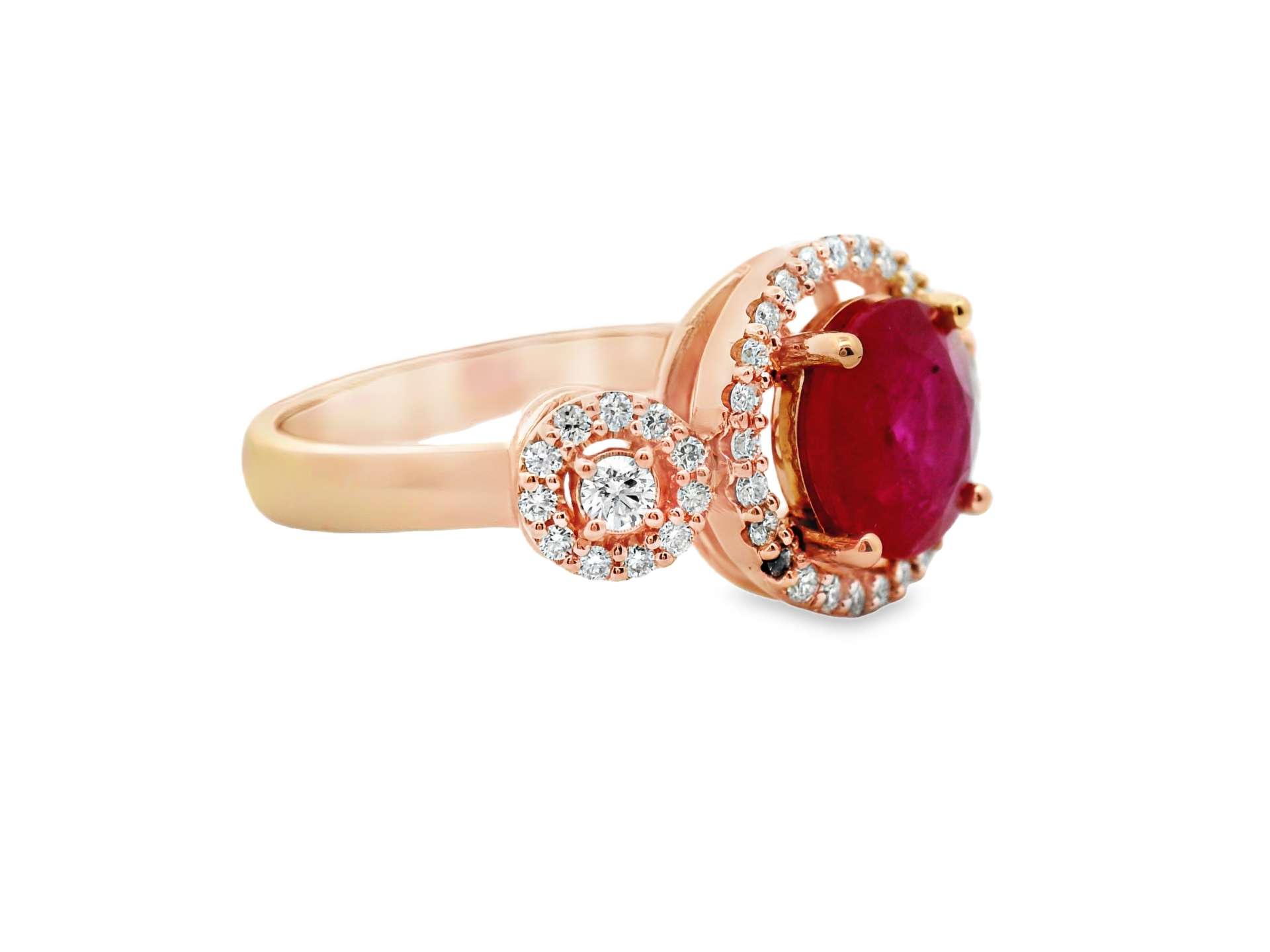 This elegant ring showcases a captivating oval-shaped natural Ruby as its centerpiece. The Ruby is surrounded by a sparkling halo of diamonds, enhancing its brilliance and creating a luxurious look. The band features three clusters of diamonds, each adding a touch of sparkle and sophistication. The overall design and the use of rose gold give the ring a warm and romantic feel. The Ruby is certified by the International Gemological Institute (IGI), a reputable authority in gemstone grading.