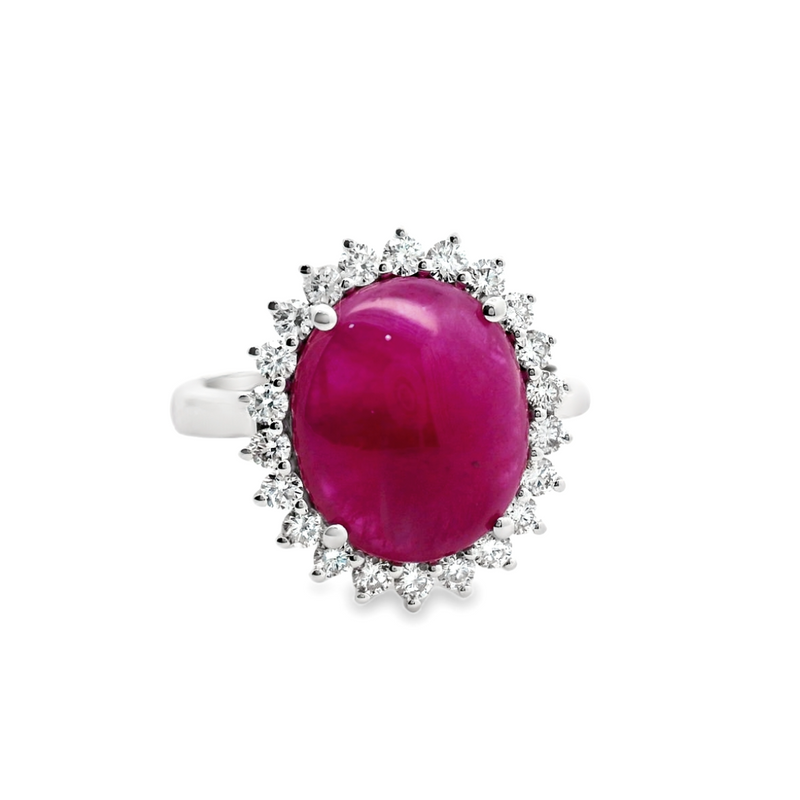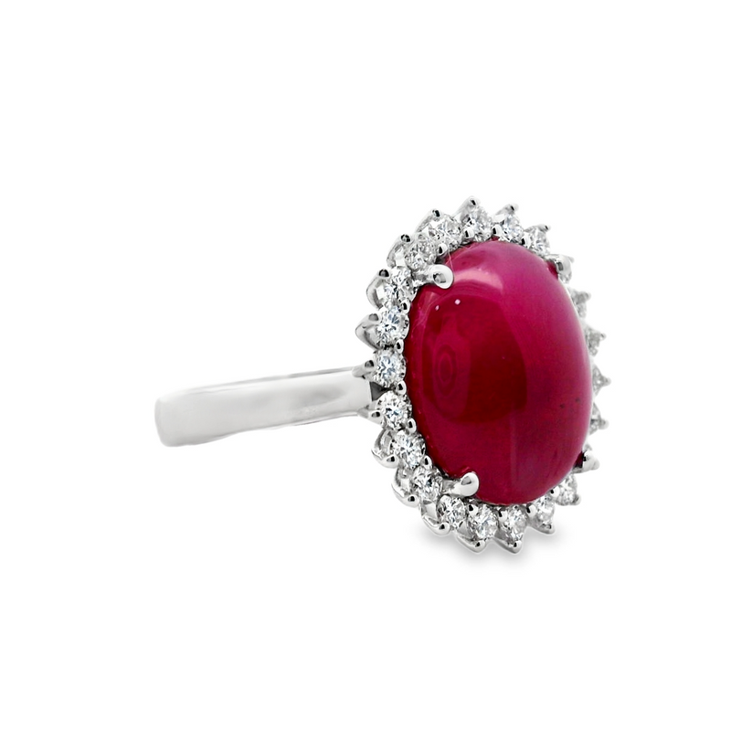 A sophisticated and elegant piece, this ring would make a stunning addition to any jewelry collection. The natural Ruby, diamonds, and 18K gold combine to create a truly luxurious and eye-catching design. A beautiful oval-shaped ruby, known for its rich, vibrant red color, is the centerpiece of the ring. People often associate rubies, one of the most precious gemstones, with passion, love, and vitality. A halo of sparkling diamonds encircles the Ruby, enhancing its brilliance and creating a dazzling effect.