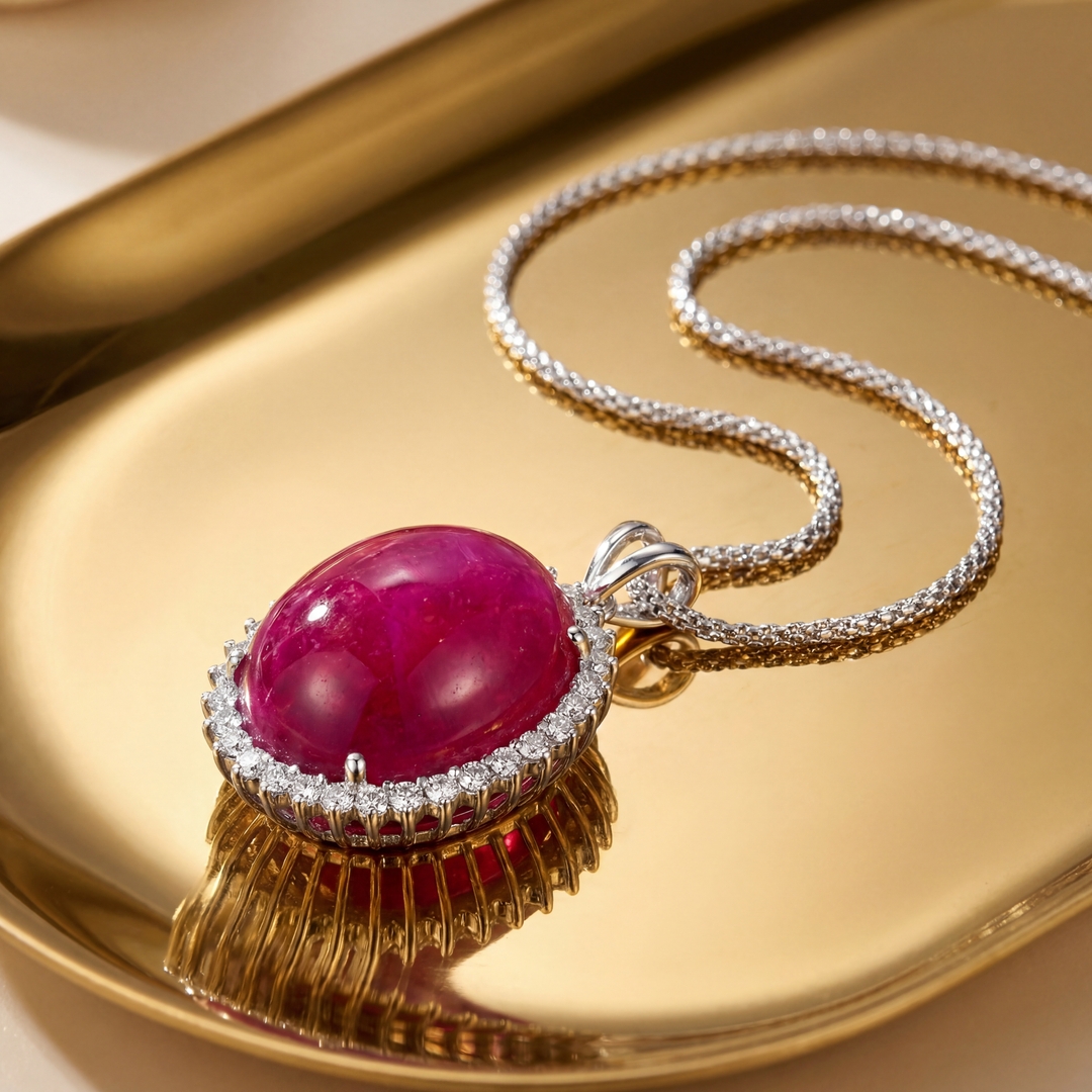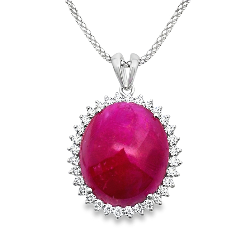 This 18K White Gold Ruby Pendant is a breathtaking statement piece for the modern woman. At its heart lies a stunning natural Ruby sourced from Africa. We selected this vibrant red gemstone for its deep color and impressive presence. The Ruby features a smooth cabochon cut. This style highlights the natural luster and depth of the 21-carat stone. To enhance its brilliance, a halo of sparkling diamonds surrounds the central gem.