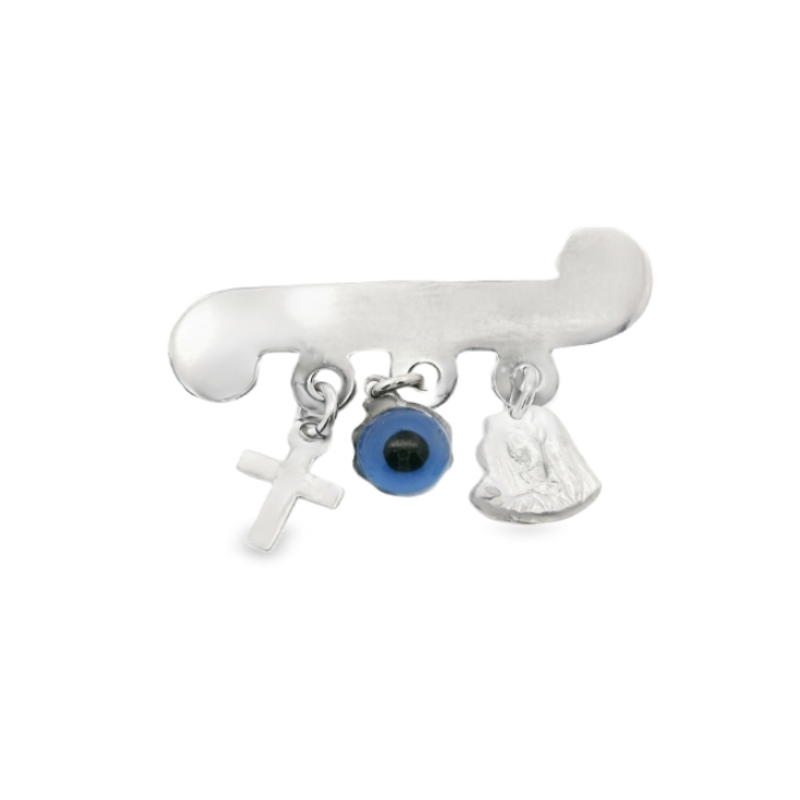 This piece is traditionally a protective or ceremonial gift, perfect for Baptisms or Christenings. A beautiful and meaningful keepsake, this 18K White Gold Safety Pin Brooch symbolizes protection. The sturdy, rounded pin bar holds three classic charms: a traditional cross, a vibrant blue Evil Eye bead, and a miniature religious figure. The Evil Eye wards off negative energy. Crafted entirely from luxurious 18-karat gold, this pin features a polished, high-quality finish. It’s perfect for securing to a baby’s blanket, clothing or a lapel. It’s an ideal choice for a Christening, Baptism, or celebrating a new arrival.