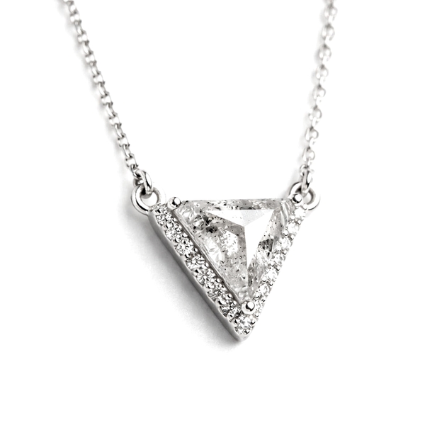 The triangular 18K gold pendant perfectly frames the 0.43carats salt and pepper diamond, creating a modern and eye-catching design. Salt and pepper diamonds are diamonds with distinctive inclusions. These natural imperfections create a mottled appearance, resembling salt and pepper sprinkled throughout the stone. The unique patterns and colors of each salt and pepper diamond make it one-of-a-kind. The pendant is suspended from an 18K gold cable chain 40cm long.