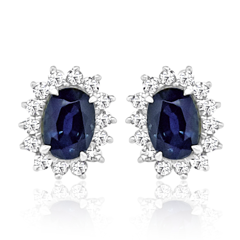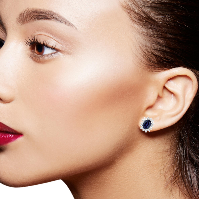 This pair of blue sapphire and diamond earrings is the perfect epitome of elegance. The blue sapphires are prong-set on a classic four-prong setting and surrounded by a total of 0.44 carats of round brilliant diamonds. These earrings are composed of a pair of exceptionally natural blue sapphires with a total of 1.68 carats, ethically sourced and precisely matched by our expert jewelers. The butterfly clasp allows you to wear the pair with a snap-back, making it the perfect pair of everyday earrings.
