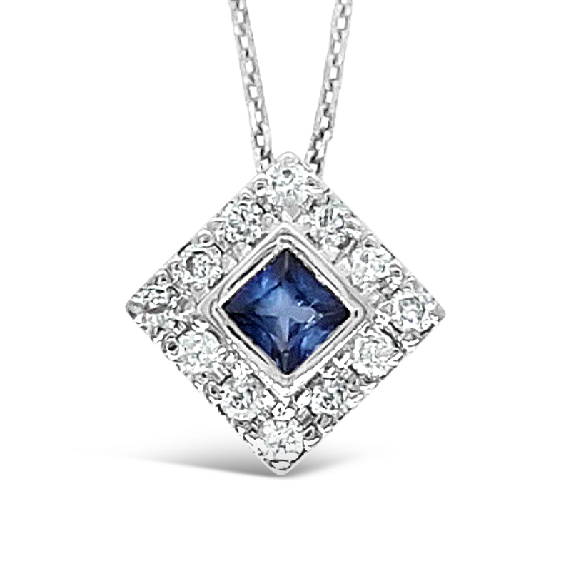 A beautiful combination of diamonds and a sapphire, this 18K white gold pendant is ideal for the woman who loves to add a touch of elegance to her everyday looks. The pendant showcases a 0.24 cts sapphire surrounded by a halo of diamonds with a total of 0.27cts weight. This pendant is suspended from a 18K white gold cable chain 45cm long.