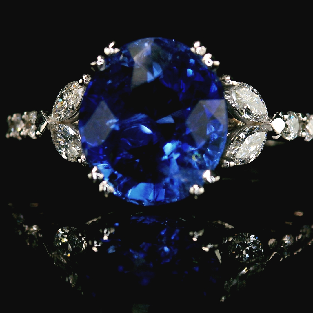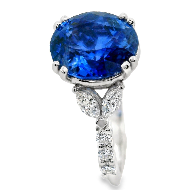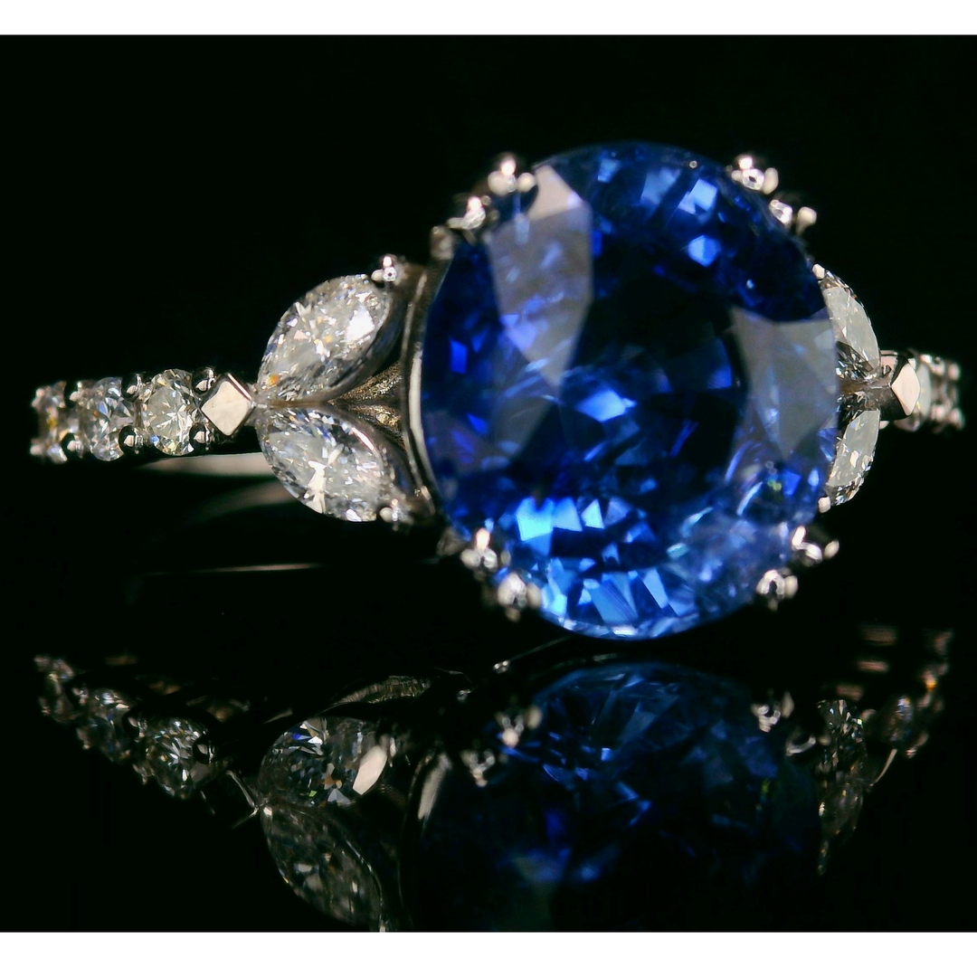 This magnificent ring is made from 18K white gold. It features a stunning 3.57-carat natural blue sapphire at its center. Artful prongs hold this vibrant stone securely. The sapphire’s deep blue color stands out. It contrasts beautifully with the sparkling diamonds and shiny white gold. The ring’s design also includes 0.45 carats of diamonds. On each side of the sapphire, two marquise-cut diamonds form a delicate leaf shape. A cluster of brilliant round diamonds sits alongside them on the band. The sleek, polished band makes this a sophisticated and luxurious piece. It will truly be a timeless treasure.