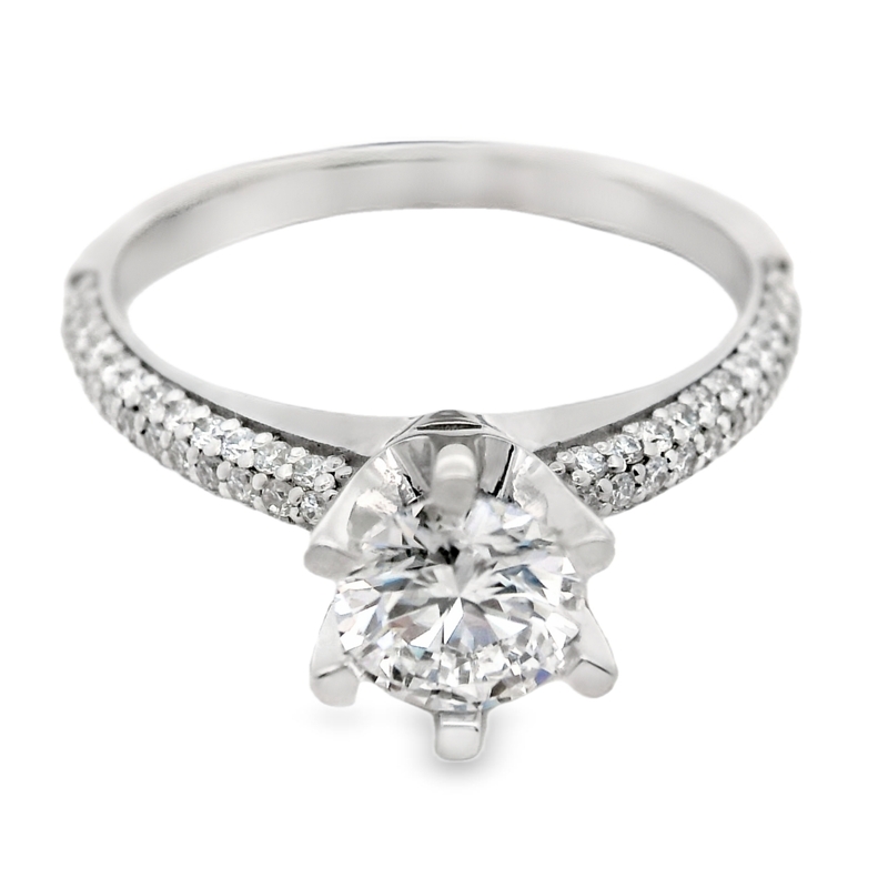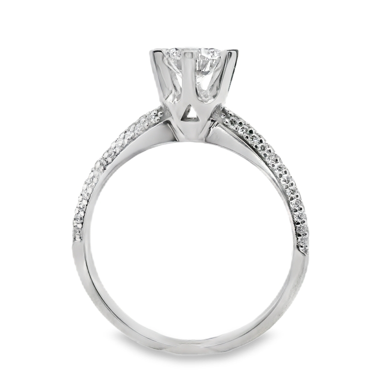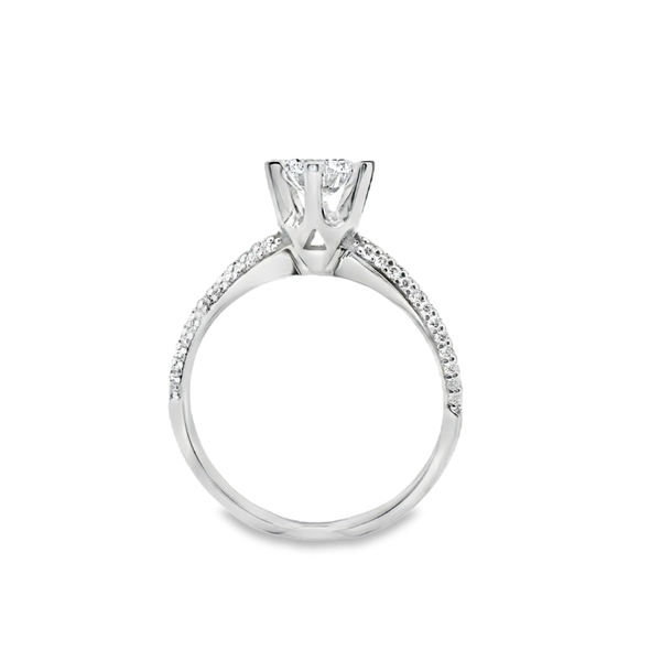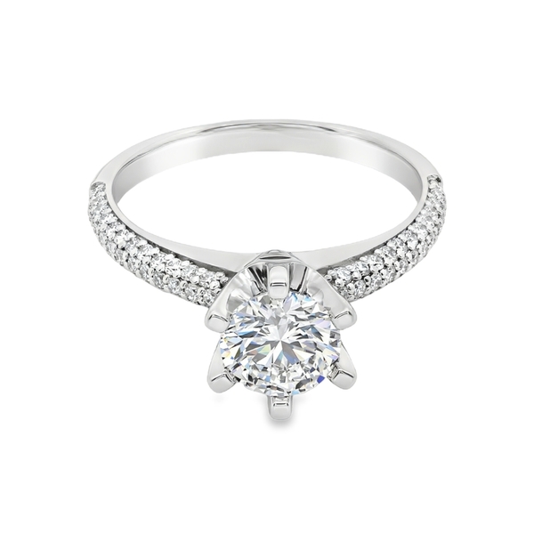Exquisite in its simplicity, this engagement ring captures timeless elegance. A round brilliant-cut diamond takes center stage, held securely by delicate prongs. The band, crafted in luminous 18K white gold, is pavé-set with dazzling accent diamonds, adding a touch of captivating sparkle from every angle. This ring is a beautiful symbol of your enduring love story.