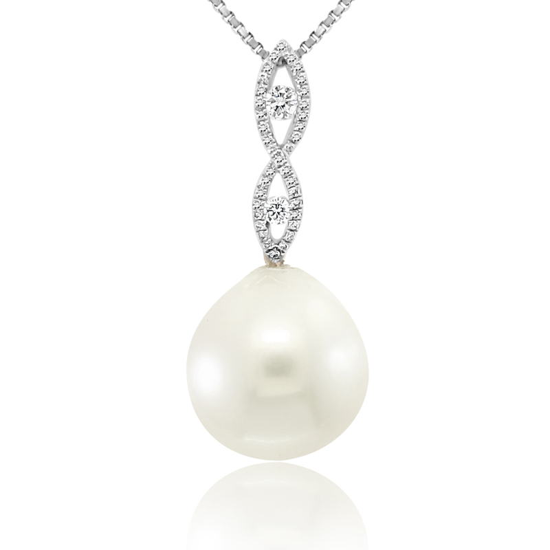 A beautiful combination of diamonds and a South Sea pearl, this 18K white gold pendant is ideal for the woman who loves to add a touch of elegance to her everyday looks. The pendant showcases a 13mm South Sea Pearl with 0.14pts of diamonds. The price does not include the chain.