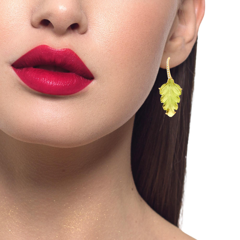 This pair of tourmaline earrings is unique in design, featuring two hand carved green leaves tourmalines crafted in 18k yellow gold. The tourmaline leaves are suspended from a hook, accentuated by four prong-set round brilliant 0.10 points diamonds. The tourmalines are hand-selected for their intense green color and the total weight is 12.40 carats. Our jewelers take great care to hand-set the tourmalines in a way that exposes its most beautiful facets. The earrings are designed to be light and comfortable to wear.