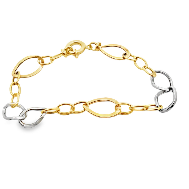 This is a contemporary and fashionable chain bracelet that features an elegant tri-tone look with contrasting yellow, rose and white gold links. Crafted from 18K gold, utilizing both yellow, rose and white gold links to create a striking mixed-metal aesthetic. The links are highly polished, ensuring a bright, luxurious shine. The bracelet is composed of alternating sizes of elongated oval links. The links have a flat, smooth profile, which gives the chain a sleek, modern drape. This bracelet offers a versatile, modern look, combining the three colors of gold. It is ideal for stacking or as a simple, elegant statement piece. It is secured by a round, polished spring ring clasp.