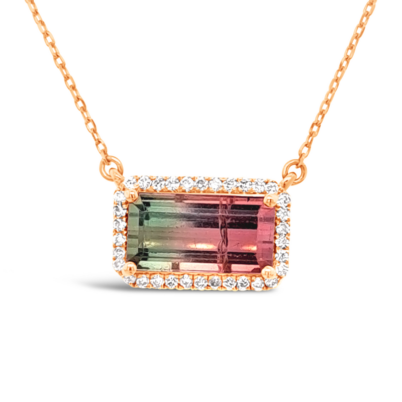 This necklace is a masterful work of art that uses 18K rose gold and watermelon Tourmaline that weighs 2.51 carats, to create a unique, wearable piece of art. The pendant is set with round 0.20 carat diamonds to give it a beautiful sparkle and shine. This necklace is the perfect statement piece. It is a stunning necklace that is sure to get you noticed.